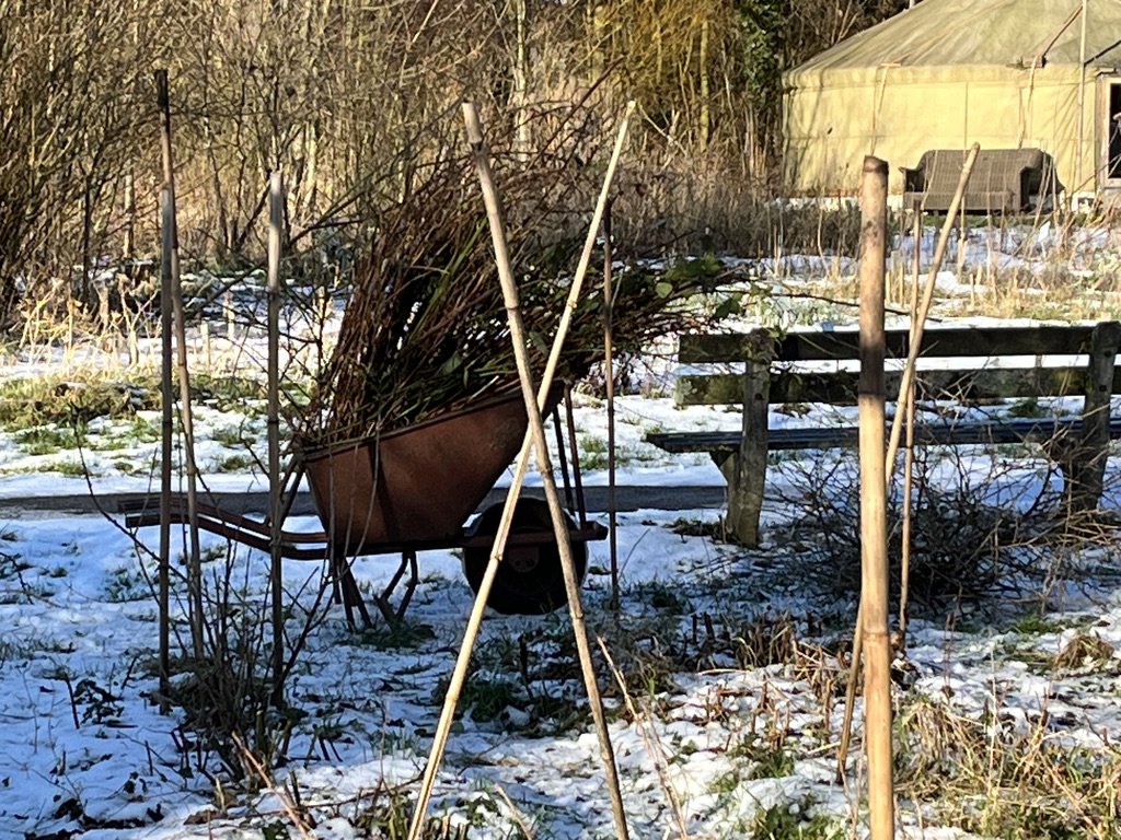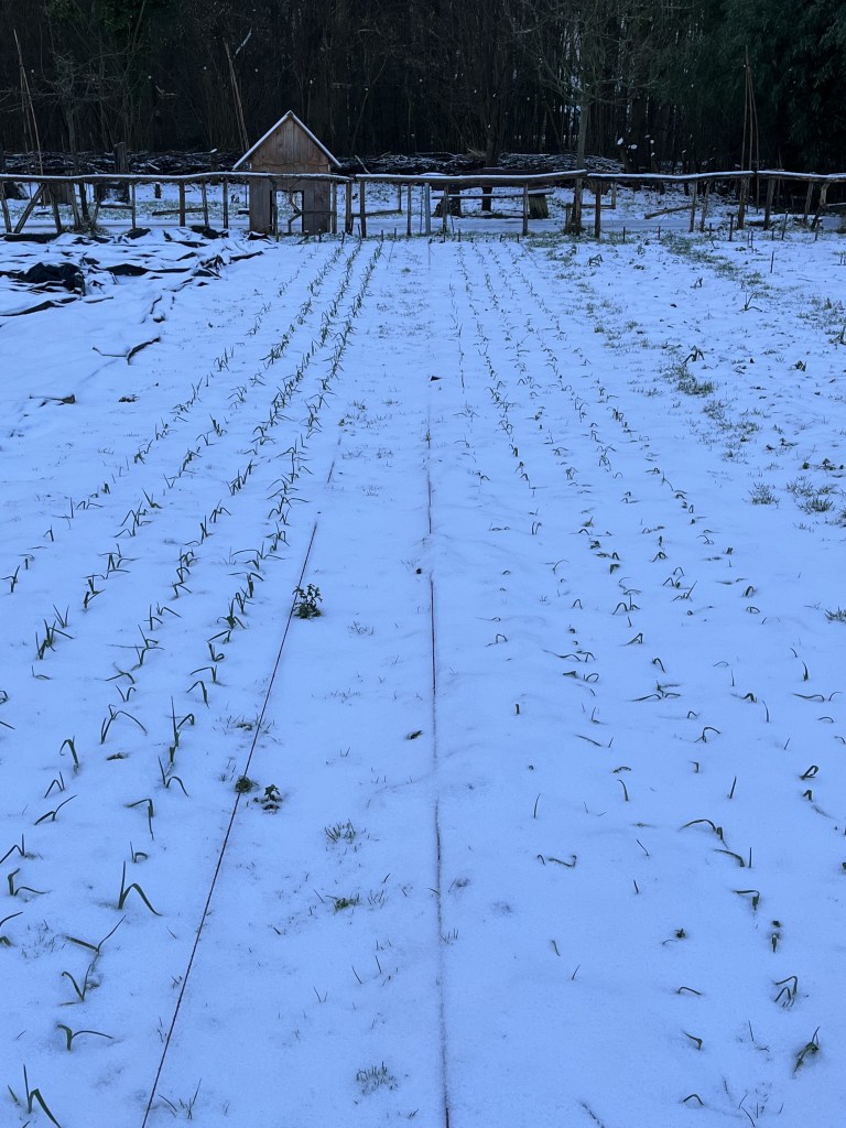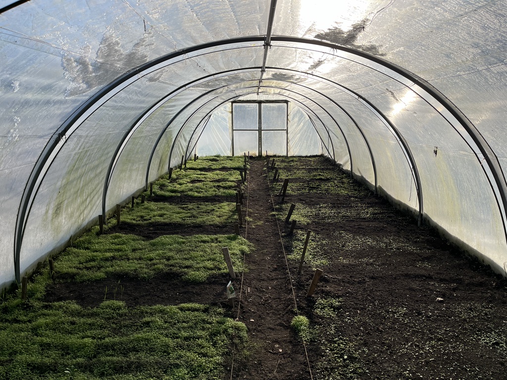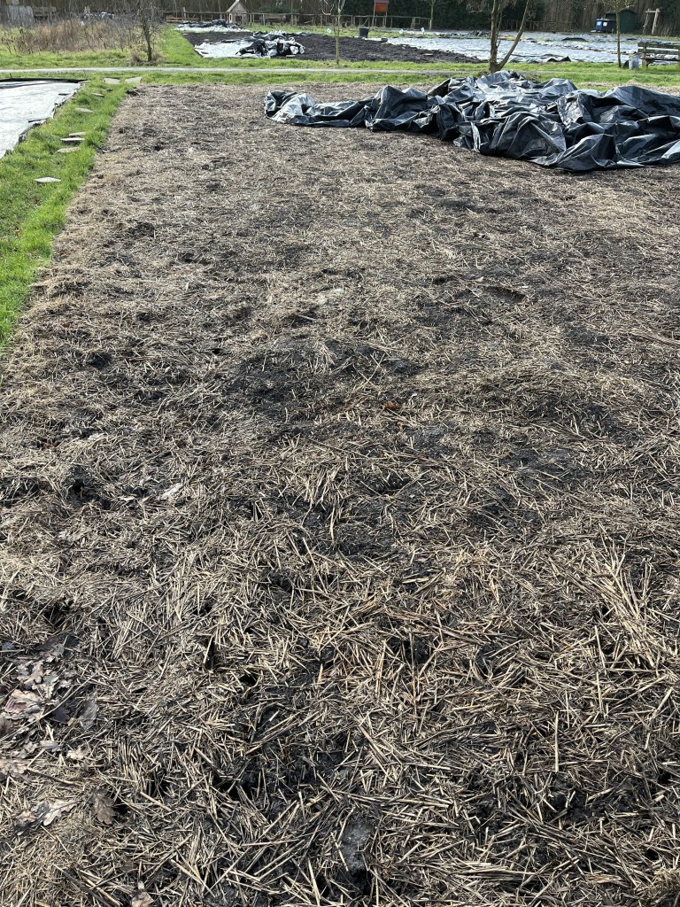 We zijn weer begonnen! Afgelopen vrijdag hebben we in klein teamverband de kop eraf gewerkt. Er was veel landbouwplastiek weggewaaid door de verschillende stormen (ja het waait verrassend veel de laatste paar maanden) en daardoor kregen we goed zicht op de toestand van de bodem. En ik werd daar heel blij van. De bodem is de bodem van ons bestaan. Het is goed daar af en toe bij stil te staan. In de bodem wordt de basis gelegd voor een goede oogst. Ze moet mooi kruimig zijn zodat de wortels hun weg kunnen vinden, voldoende mineralen bevatten en andere voedingsstoffen, voldoende bacteriën en schimmels hebben, gevolgd door ander bodemleven, vocht vast houden, etc. En zowaar, de meeste bedden laten een losse, kruimige, vochtige bodem zien vol met bodemleven. Ja ook woelmuizen en spitsmuizen, hier en daar een mol maar die mogen er ook zijn. In veel bedden kunnen we -na eventueel toevoegen van compost- direct planten en zaaien. Heerlijk. Dat scheelt ons een hoop werk. Natuurlijk zijn nog niet alle bedden zover, vooral niet de bedden die niet afgedekt zijn of nog maar kort, maar we hebben ook nog wat weken te gaan. Het wordt allengs warmer en lichter een dat versterkt de werking van het landbouwplastiek.