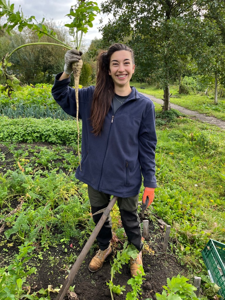 - Pastinaak (bed 10, voor de sterken onder ons: pak de spitvork die bij de knolselderij staat en graaf de pastinaak voorzichtig uit, is best een klus zo in de klei, 1 per persoon). Het gaat hier om de pastinaken op bed 10, en dus niet op bed 13).