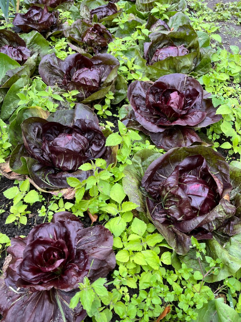 - Roodlof , voor de liefhebber, ook mooi bitter, (bed 19, nekje zoeken en afsnijden, 1 krop per persoonsaandeel), zoek de grootste uit, degene die bijna op doorschieten staat. Aan de buitenkant zien ze er lelijk uit misschien maar van binnen zijn ze glorieus!