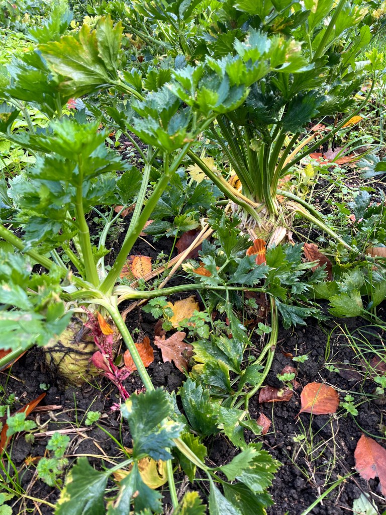 - Groenselder (bed 19, 1 per persoonsaandeel, je mag kiezen of je een paar stengels meeneemt, of de hele plant, afsnijden bij de wortel). Groenselder is het groene zusje van bleekselder. Wij bleken niet, dus worden de stelen groen.