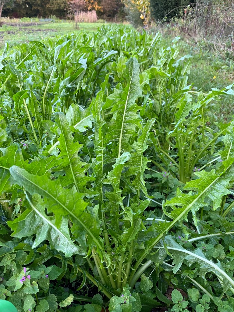 - Puntarella (bed 10, tegen de fruittuin aan, nekje zoeken en afsnijden) , Italiaanse andijvie. In Italie krijgt puntarella een dikkere knol aan de onderkant maar hier blijft het een rank kropje. Lekker bitter. Eet het als andijvie.