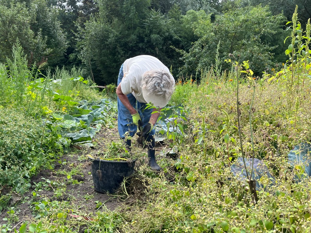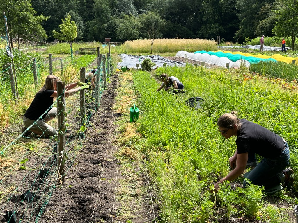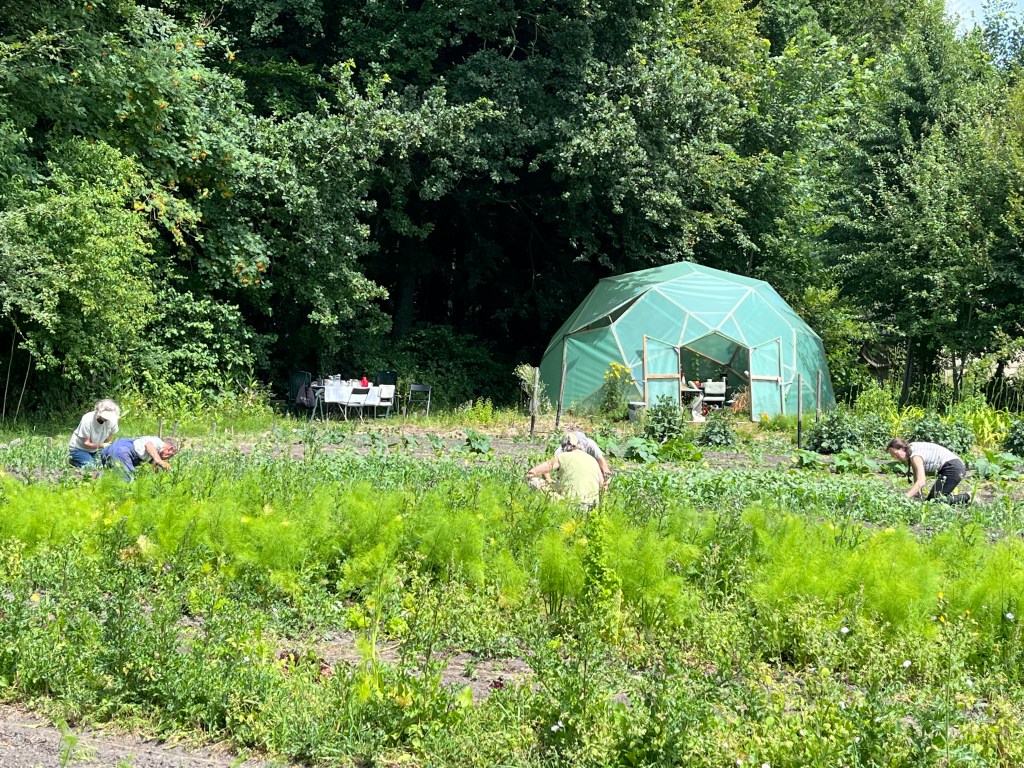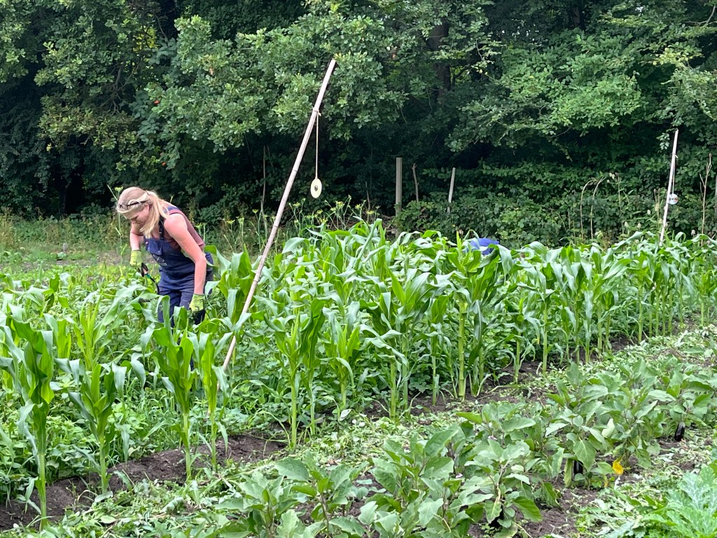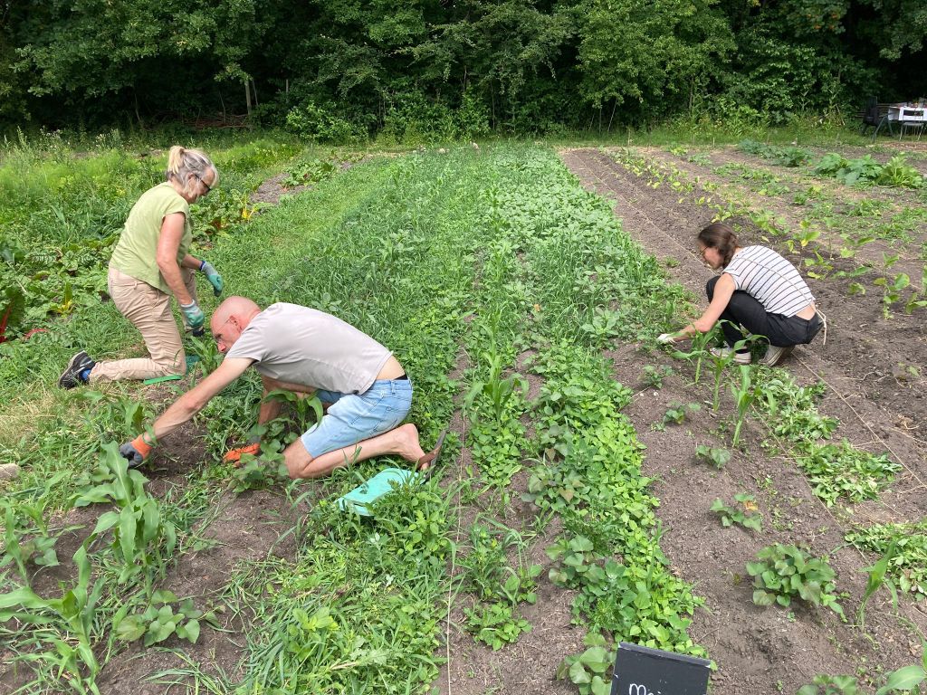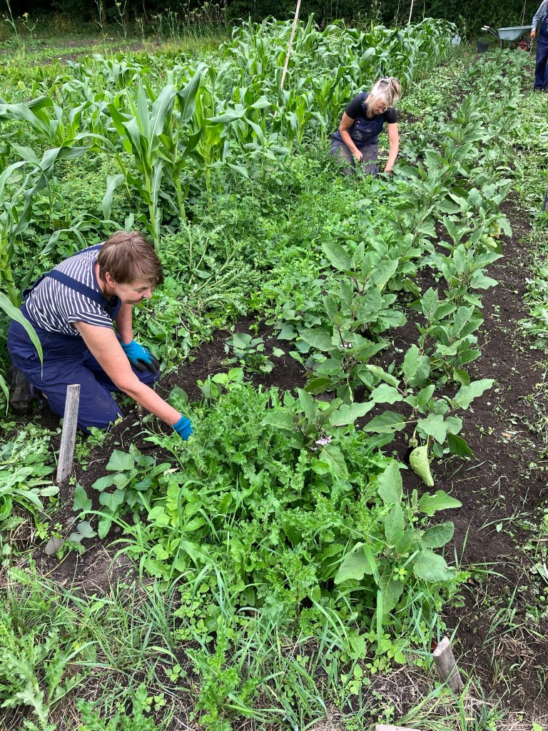 We ploegen ons langzaam door het onkruid! Ontzettend fijn dat een aantal van jullie mee komt wieden, dat helpt enorm. Ook zijn we weer wat bedden aan het schonen om meer bladgewassen neer te zetten zoals raapstelen, rucola, puntarella, postelein en snijsla. Maar 90 % van de gewassen zit in de grond! Dus het grootste zaai en plantwerk ligt al weer een paar weken achter ons. Nu nog wat onkruid wegwerken, wat zaaien en straks de pompoenen en aardappelen oogsten. En verder is het rijkdom wat de groenten en bloemen betreft!
