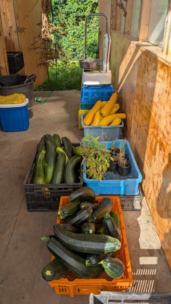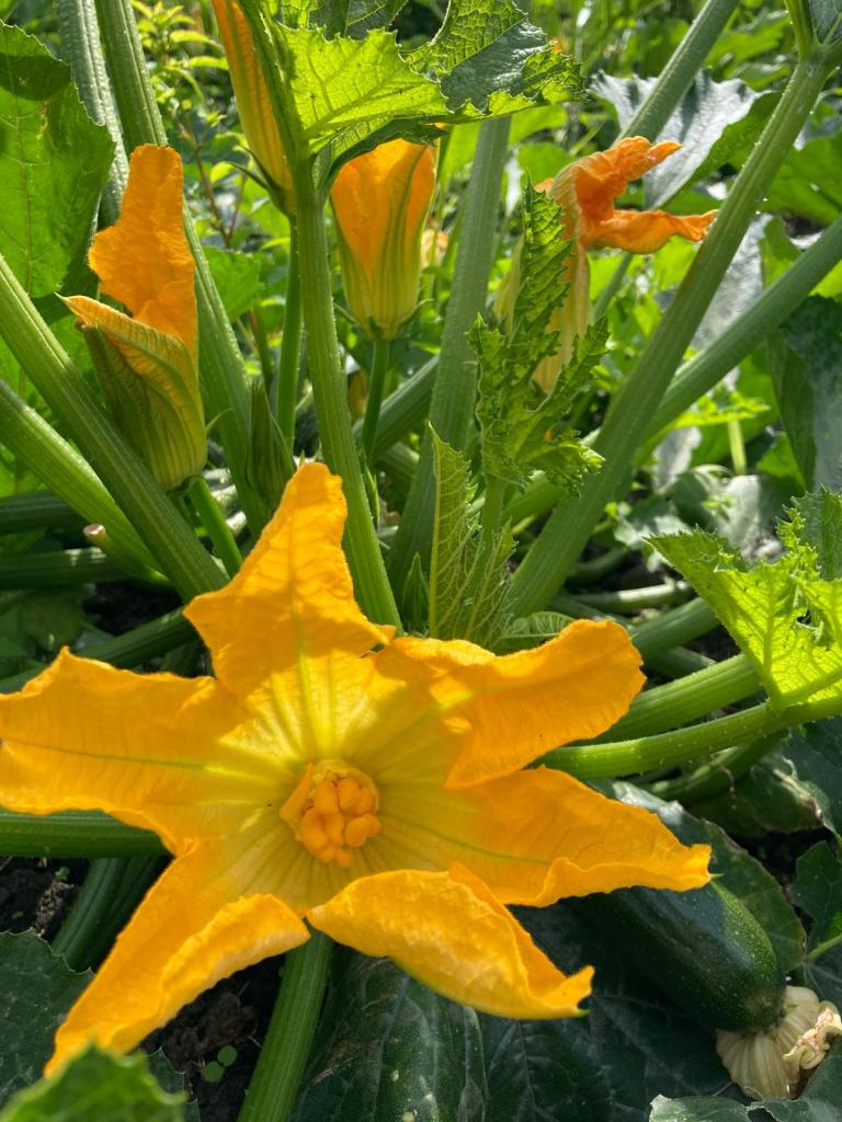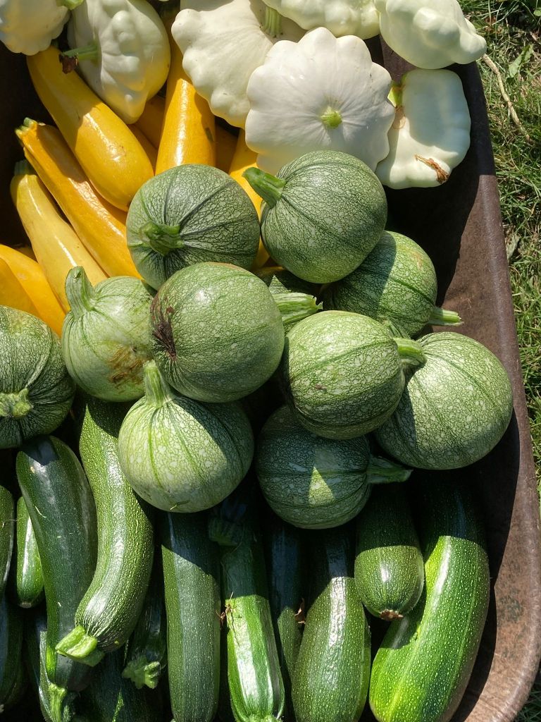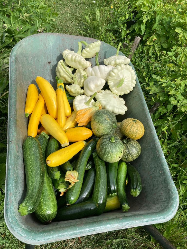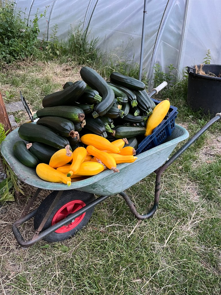 Ze blijven maar komen, die courgettes. Of ze nu groen, geel, bol- of patisson heten/zijn, allemaal doen ze het uitzonderlijk goed! Dus even dooreten. De oogstgenoten van vorig jaar weten waarschijnlijk nog wel hoe karig de opbrengst vorig jaar was. We hebben ongeveer hetzelfde aantal planten gezet maar het weer maakt het verschil (en misschien onze bemestingsaanpak).