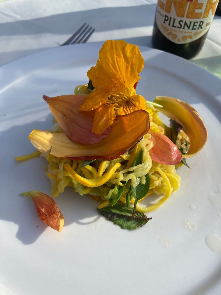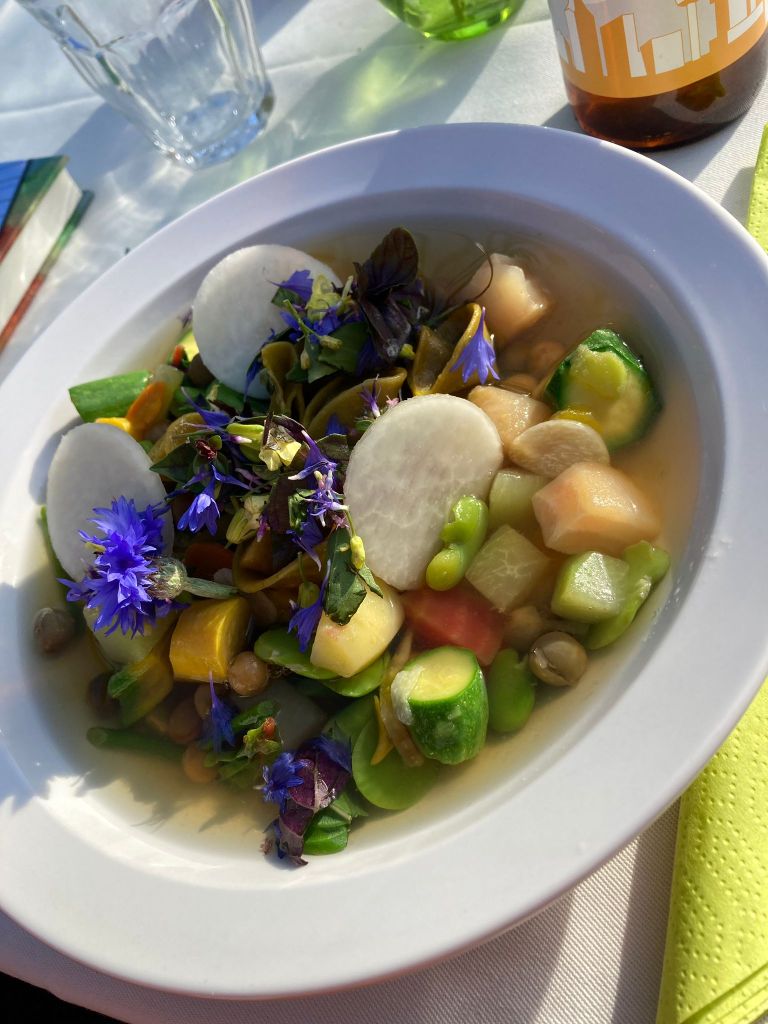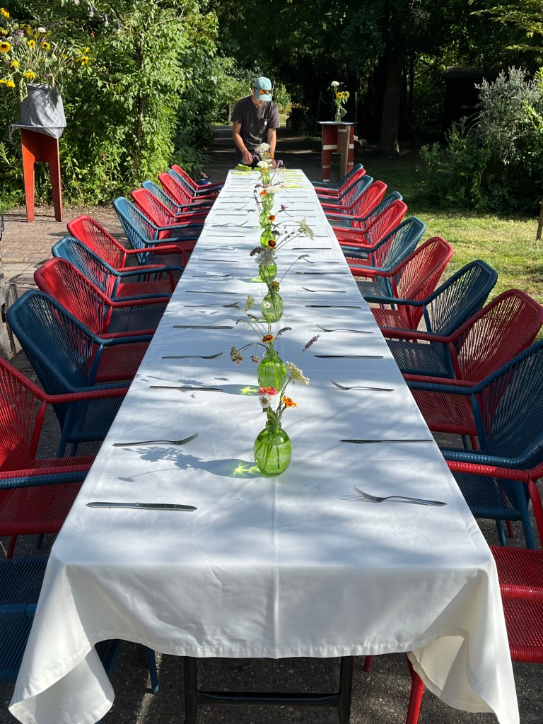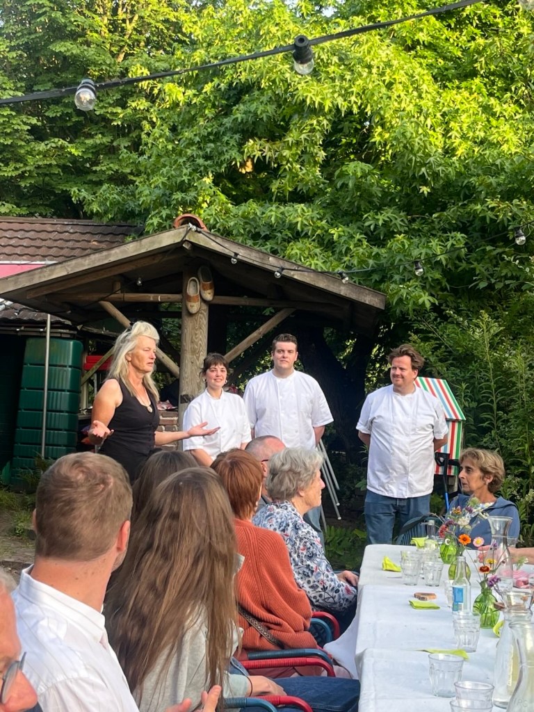 Wat was het weer een feest vorige week woensdag, ons pre-vakantie oogstdiner! Jim de Jong met zn team van Renilde heeft weer fantastisch gekookt met onze groentjes. Wat dacht je van huisgemaakte ricotta met courgettesalade; minestrone met zonnebloemblaadjespasta; knolvenkelijs met gekarameliseerde bietjes en dahlias. Mamamia. In een woord ‘fantastisch’. En het goede nieuws is dat we op 20 september weer een oogstdiner hebben en de aanmeldingen stromen al binnen.
