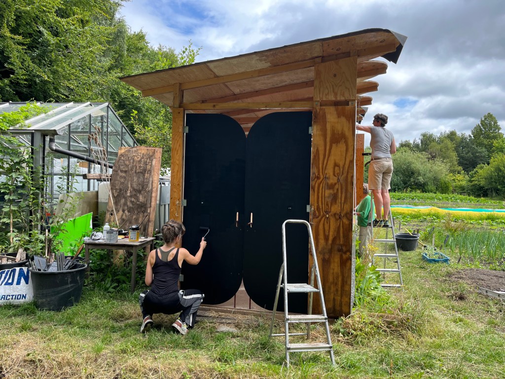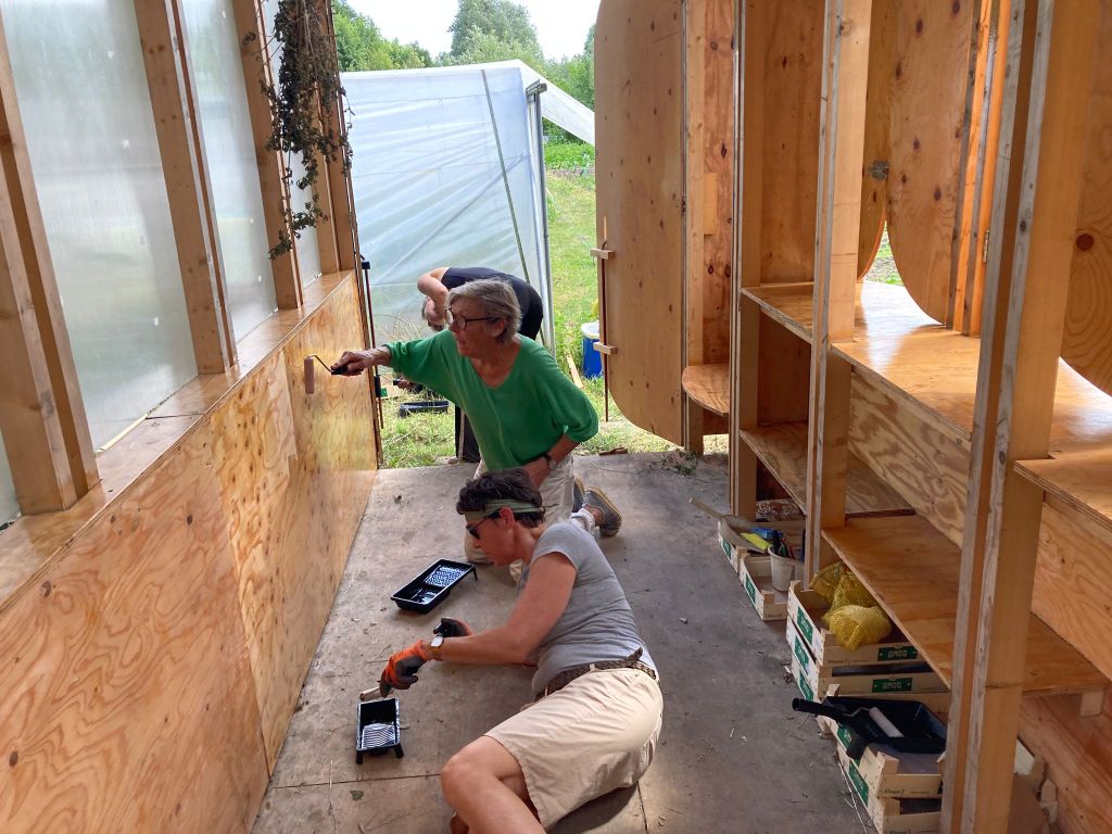 de tuin is nu echt op haar mooist, met de zonnebloemen, de wortelschermen, het wuivend rogge. Met het water van de afgelopen dagen ziet alles er fris en vitaal uit. En netjes ook nog. Dankzij de meewerkdag van 10 dagen geleden is er veel onkruid verdwenen en het paviljoen lekker in de beits gezet. En Rosien heeft flink huisgehouden met de bosmaaier zodat de structuur van de tuin weer helder wordt, en afgelopen week hebben we de pompoenen en courgettes in bedjes van stro gelegd, wederom om het onkruid te onderdrukken. Oogstgenoot Yukio heeft de pomp en de sproeier nogmaals gerepareerd, dus we zijn klaar voor de zomer!