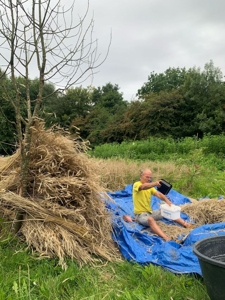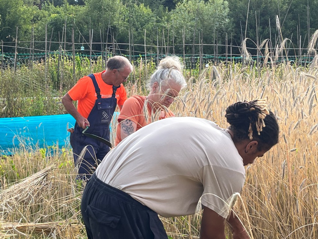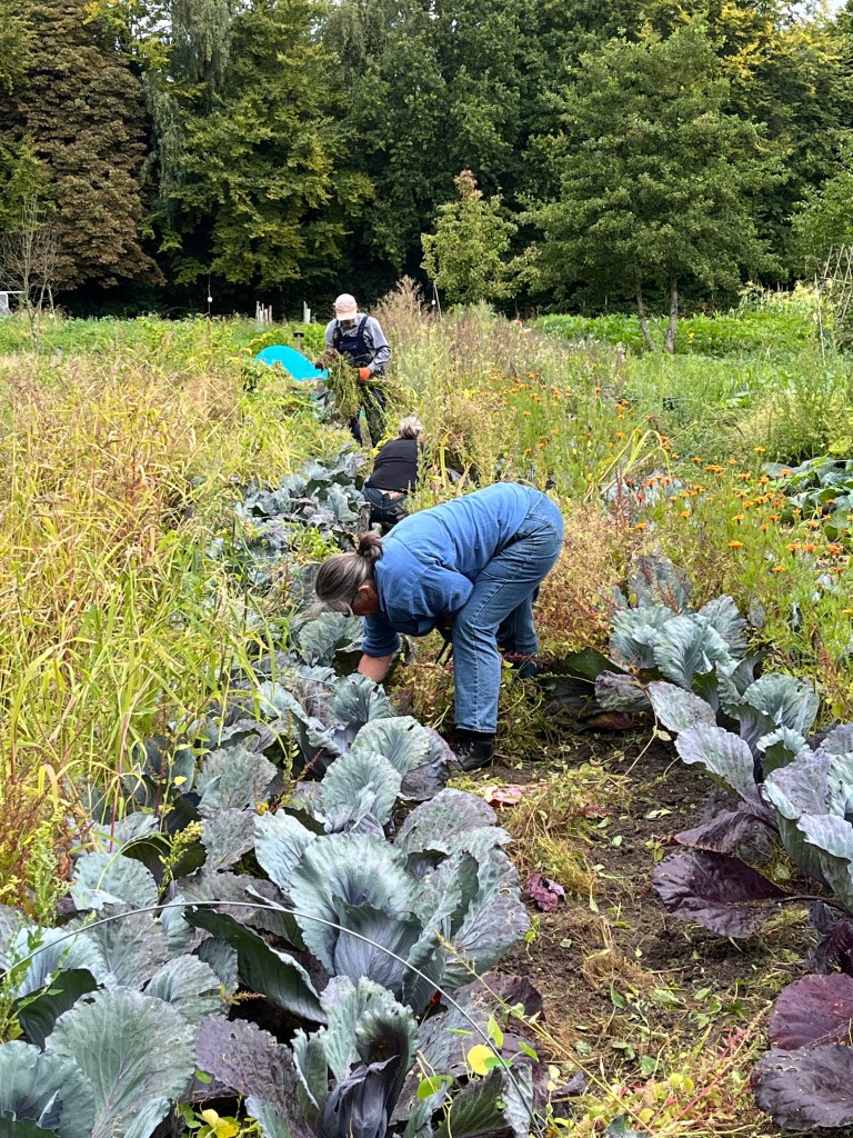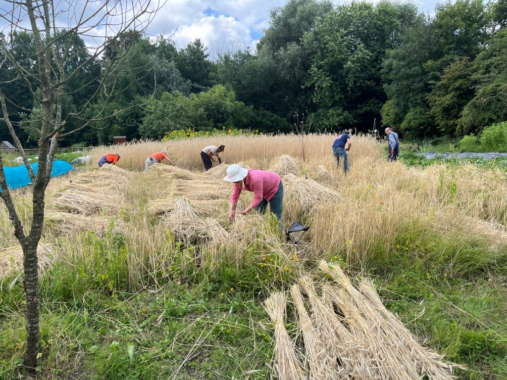 En verder hebben we geplant (knolvenkel, boerenkool, palmkool, andijvie, winterprei, knolvenkel, bindsla en eikenbladsla) en gewied. Was ook wel nodig: een van de oogstgenoten had op het stengeluibed een bosje hanepotengras geoogst. En nu is het zo dat het onkruid vaker op het gewas gaat lijken maar voor mij was het helder dat we moesten wieden. En vrijdag hebben we de winterrogge geoogst met een mens of 8, heel gezellig en ontspannen.