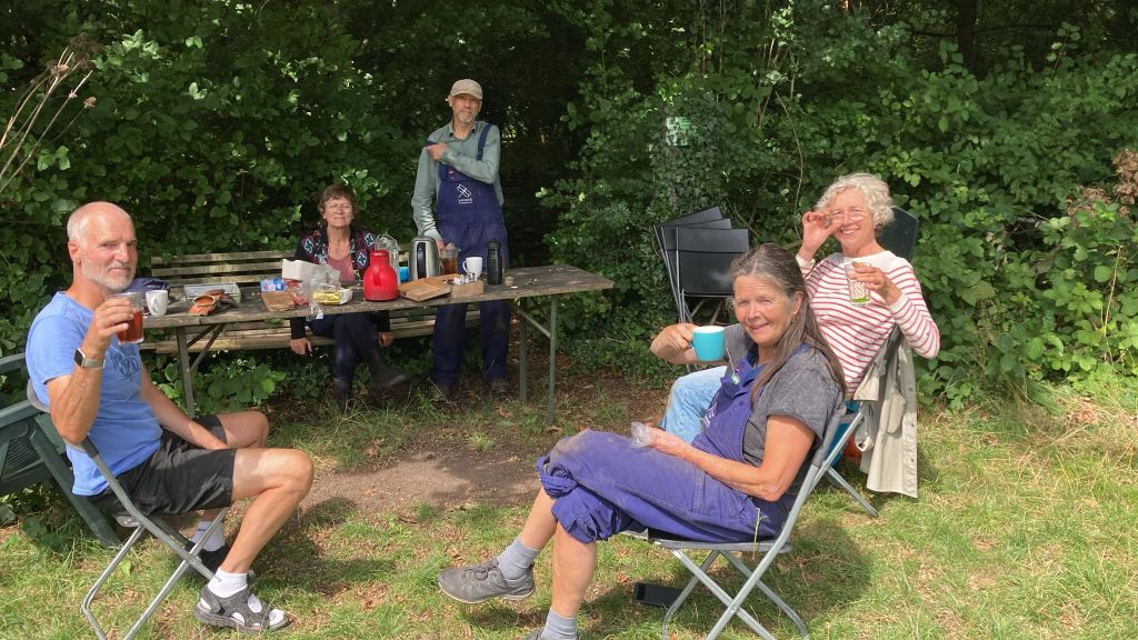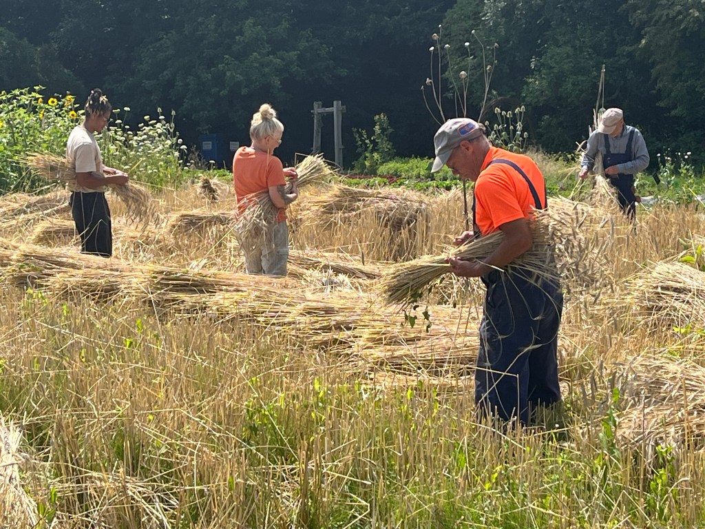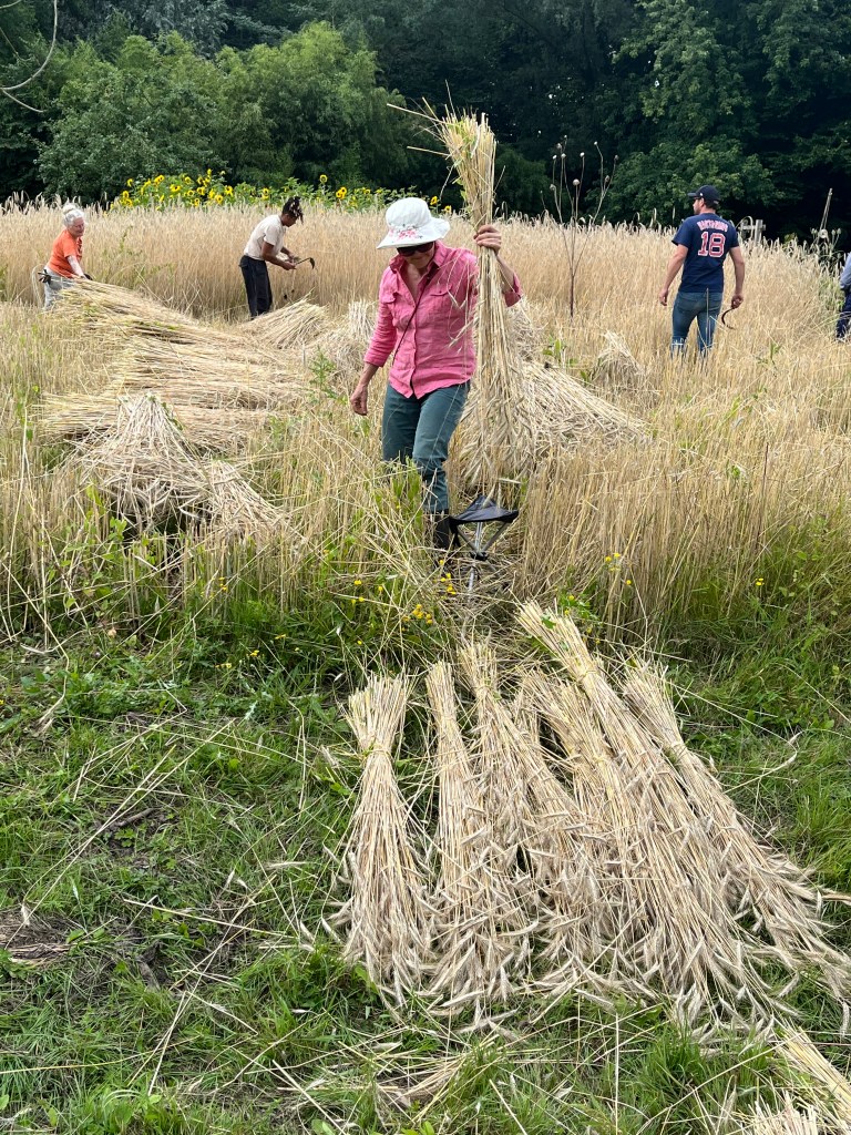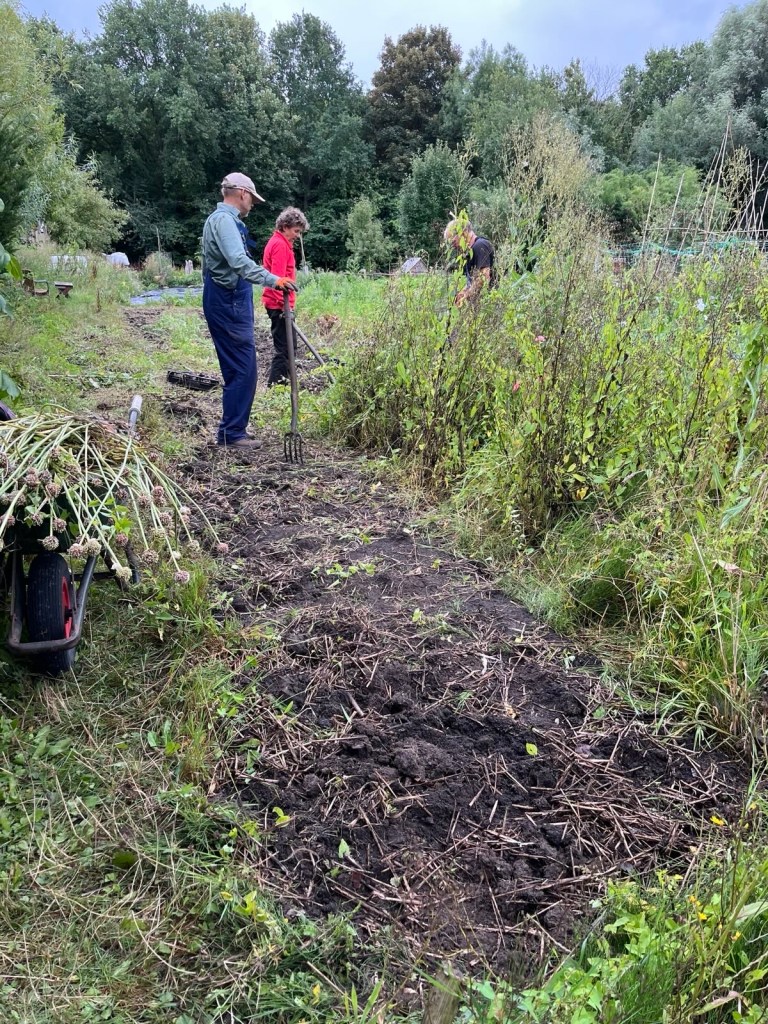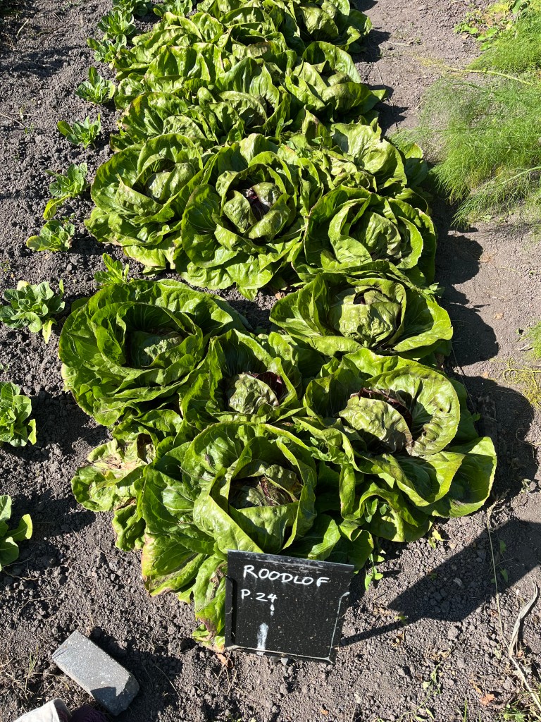 En verder hebben we geplant (knolvenkel, boerenkool, palmkool, andijvie, winterprei, knolvenkel, bindsla en eikenbladsla) en gewied. Was ook wel nodig: een van de oogstgenoten had op het stengeluibed een bosje hanepotengras geoogst. En nu is het zo dat het onkruid vaker op het gewas gaat lijken maar voor mij was het helder dat we moesten wieden. En vrijdag hebben we de winterrogge geoogst met een mens of 8, heel gezellig en ontspannen.