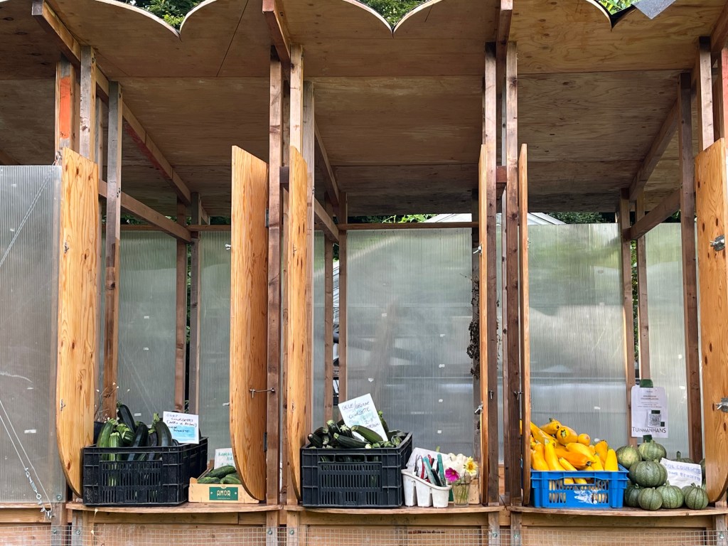 Op de kraam leggen we soms wat experimenten neer zoals de Artisjok, en ook de eerstelingen van bijvoorbeeld de courgettes. Er zijn er nu elke week wat rijp maar nog te weinig voor iedereen. Als we hebben leggen we ze op de kraam en kan je ze meepakken.