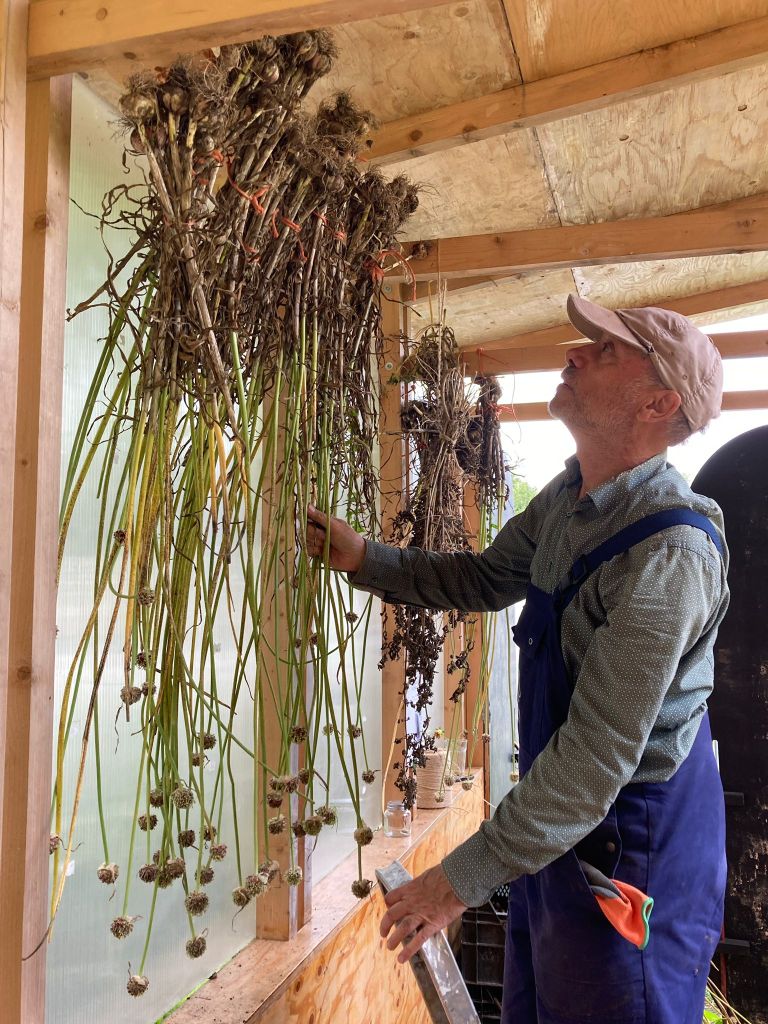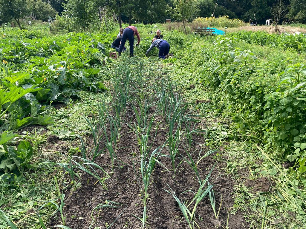 Afgelopen week is de knoflook geoogst en de gele uien. Die zijn we nu aan het drogen zodat we ze lang kunnen bewaren. Dus nog niet meenemen!