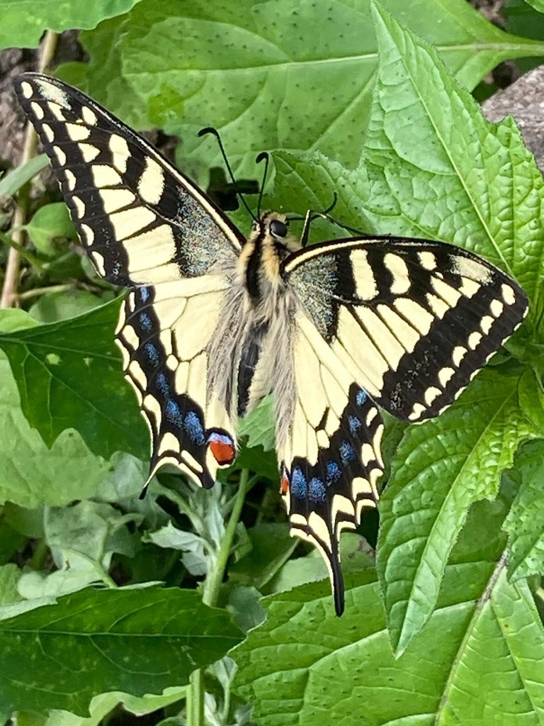 Kijk eens hoe mooi! De koniginnepage is gespot op de akker. De rupsen hadden we al eerder gezien, ook vorige jaren al, maar de vlinder nog niet. Nou ja, ik heb haar natuurlijk helemaal niet gezien omdat ik nog thuis zat, maar Hans heeft er een prachtige foto van gemaakt. Wat een prachtdier. Kan ook weer op de lijst.