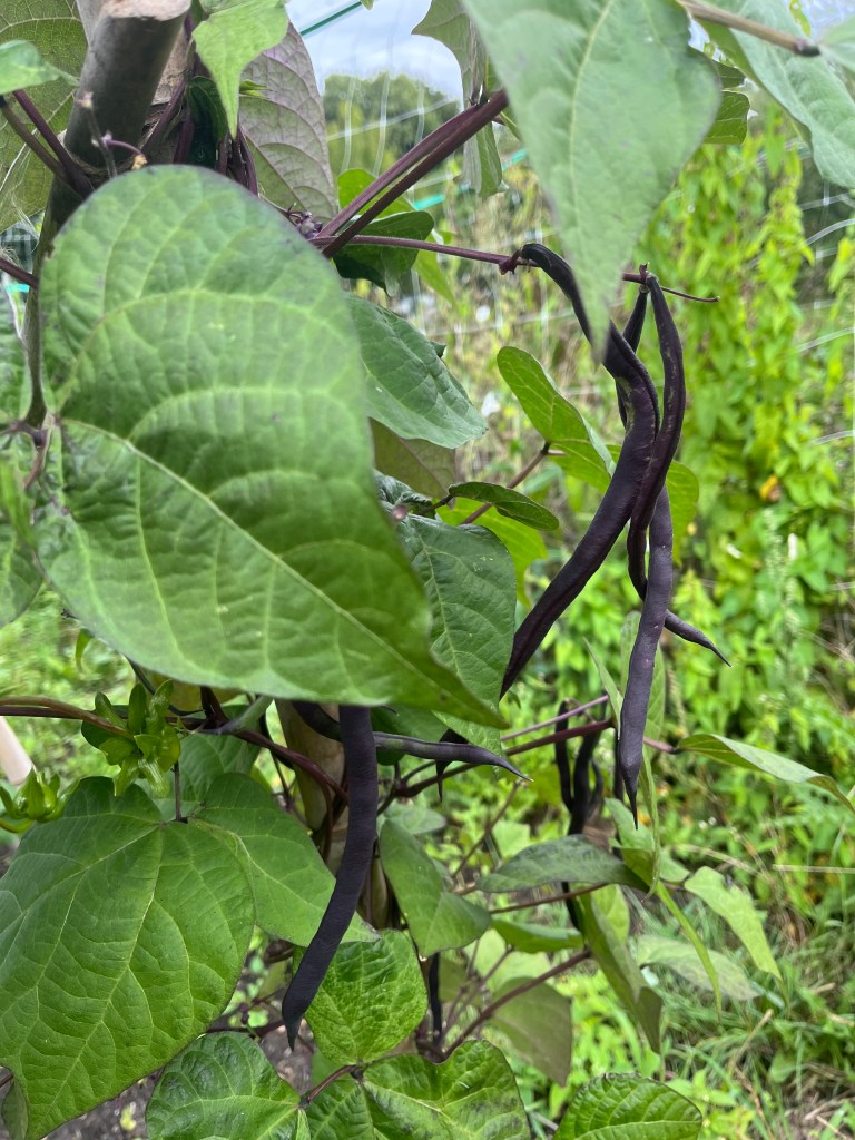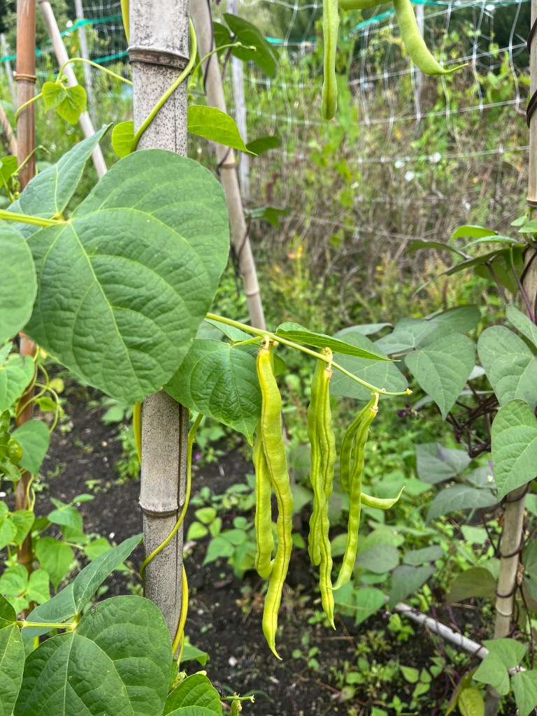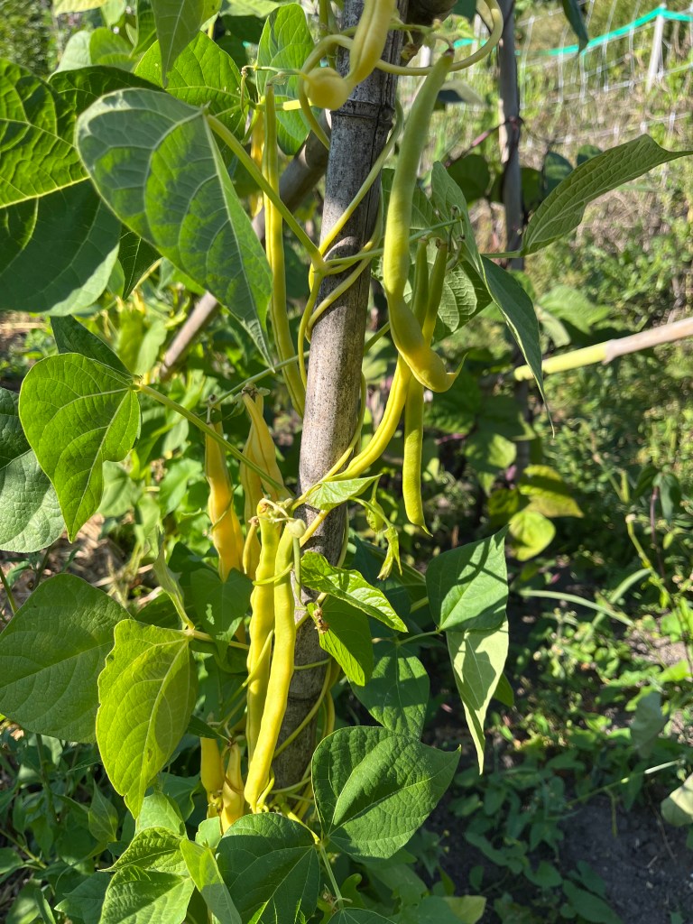 Ter info: Het vlaggetje bij de spekbonen heb ik even weggehaald omdat eigenlijk alle eerste bonen al geplukt zijn. Wees gerust, er komen er nog veel meer. Geduld! En er is even geen sla behalve de laatste eikenbladsla en de doorgeschoten bindsla op bed 1.