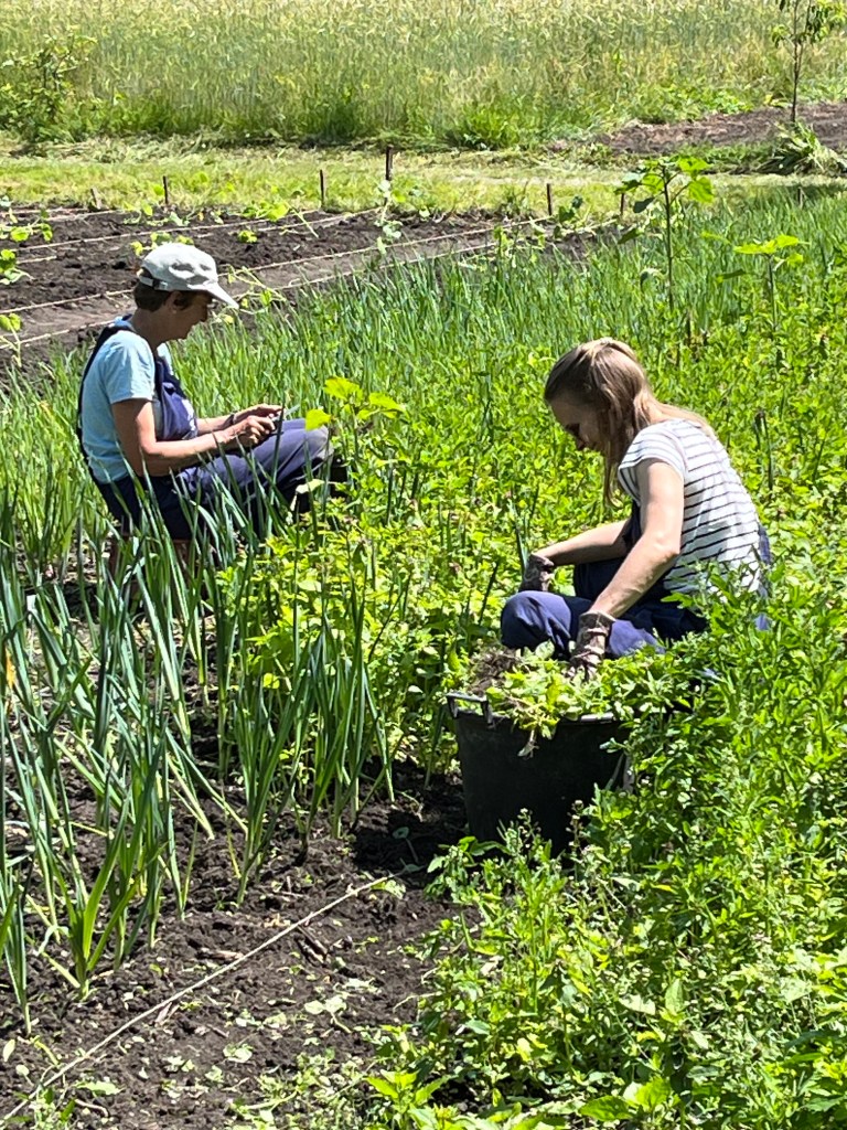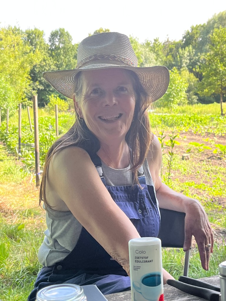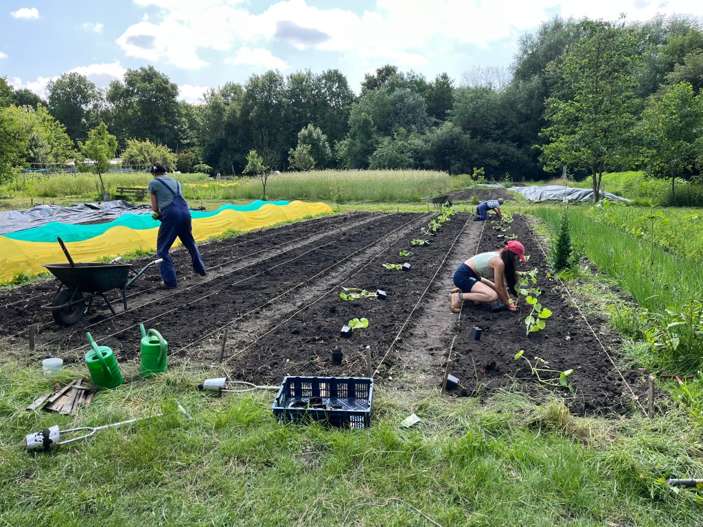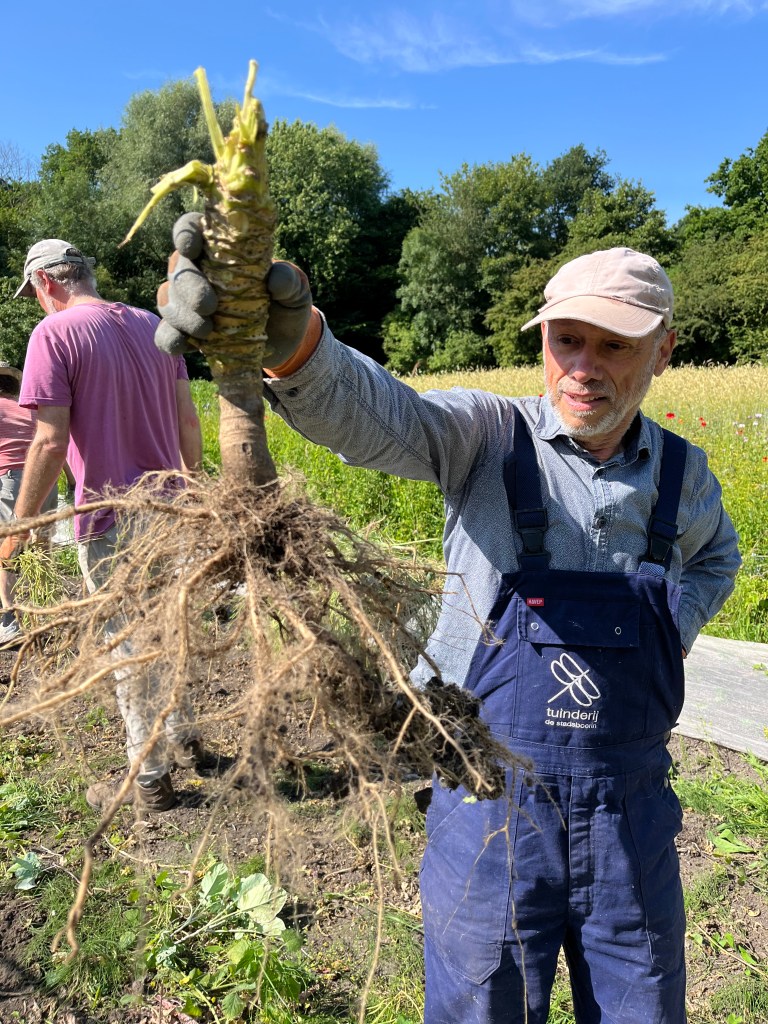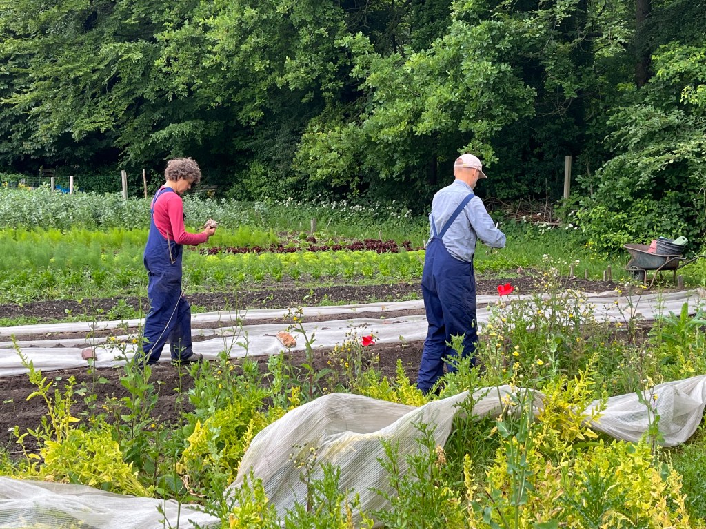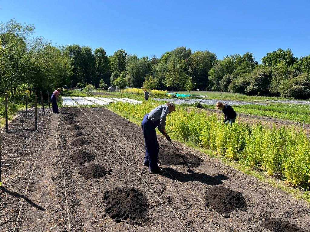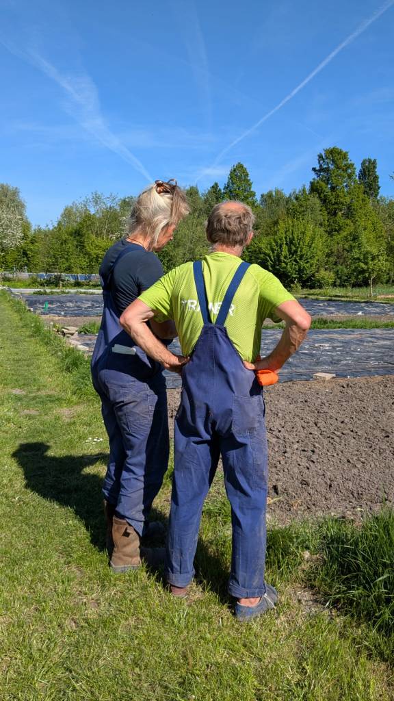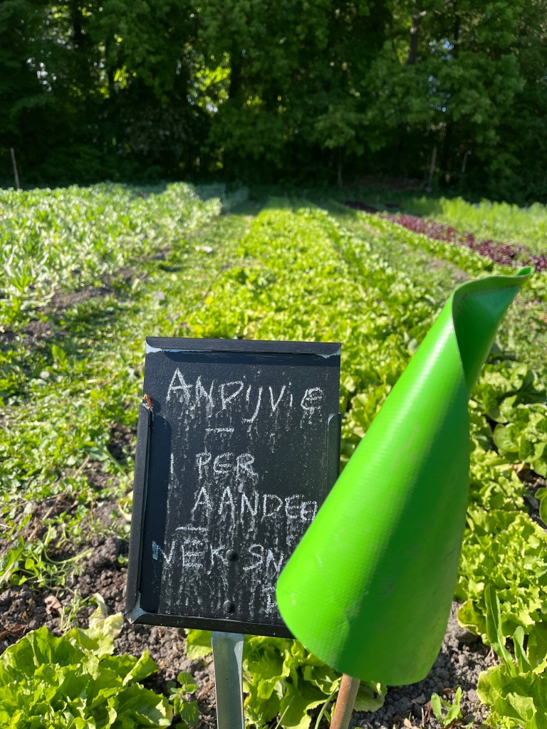 We zijn bijna weggesmolten vorige week, zo heet was het. Gelukkig was er in de vroege ochtend nog wat nachtkoelte zodat de tomaten gediefd en opgebonden konden worden. We hebben afgelopen week veel planten in de grond gezet (buiten-aubergines, rijtje zoete aardappelen, knolvenkel, radicchio, knolselderij, nieuwzeelandse spinazie) maar er ook veel uit getrokken (bijkruiden/ onkruiden/ ongewilde kruiden, zoals knopkruid bij de winterwortelen en andere gewassen). Langzaam aan met de aanhoudende wind en de hoge temperaturen wordt de bodem droger en zijn we begonnen met het nu en dan beregenen. Helaas werkt de pomp nog suboptimaal maar er wordt aan gewerkt. Voor de tussentijd duim ik voor een paar dagen regen.