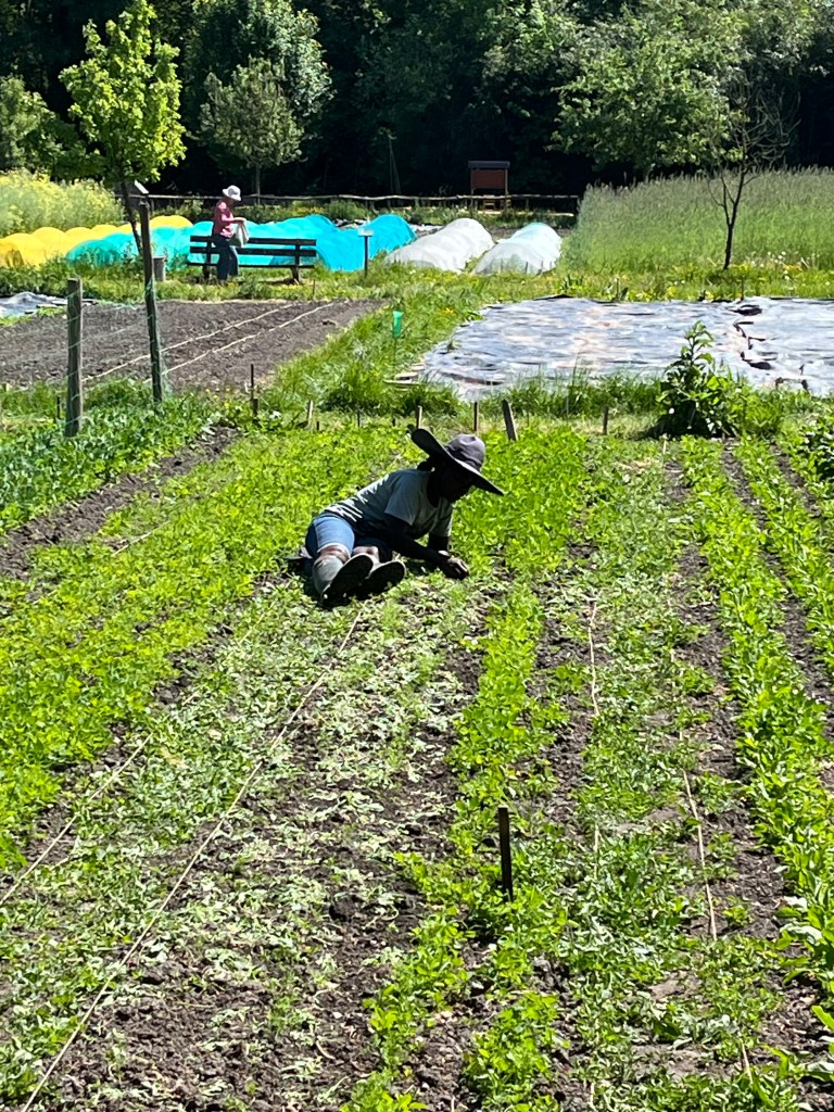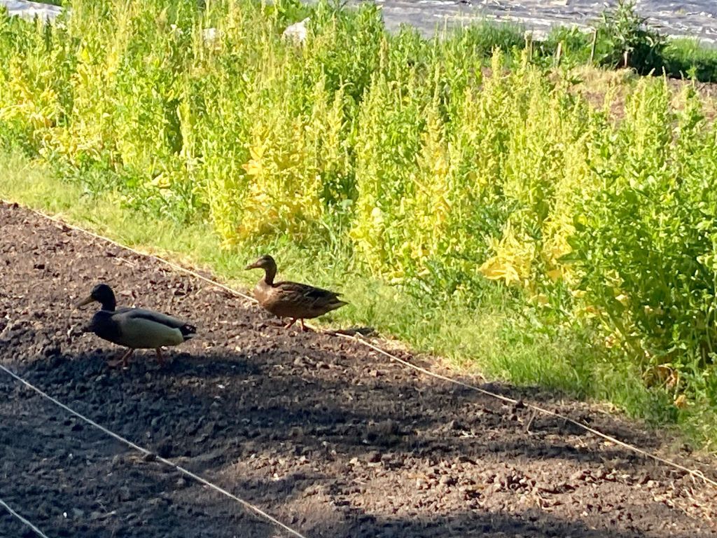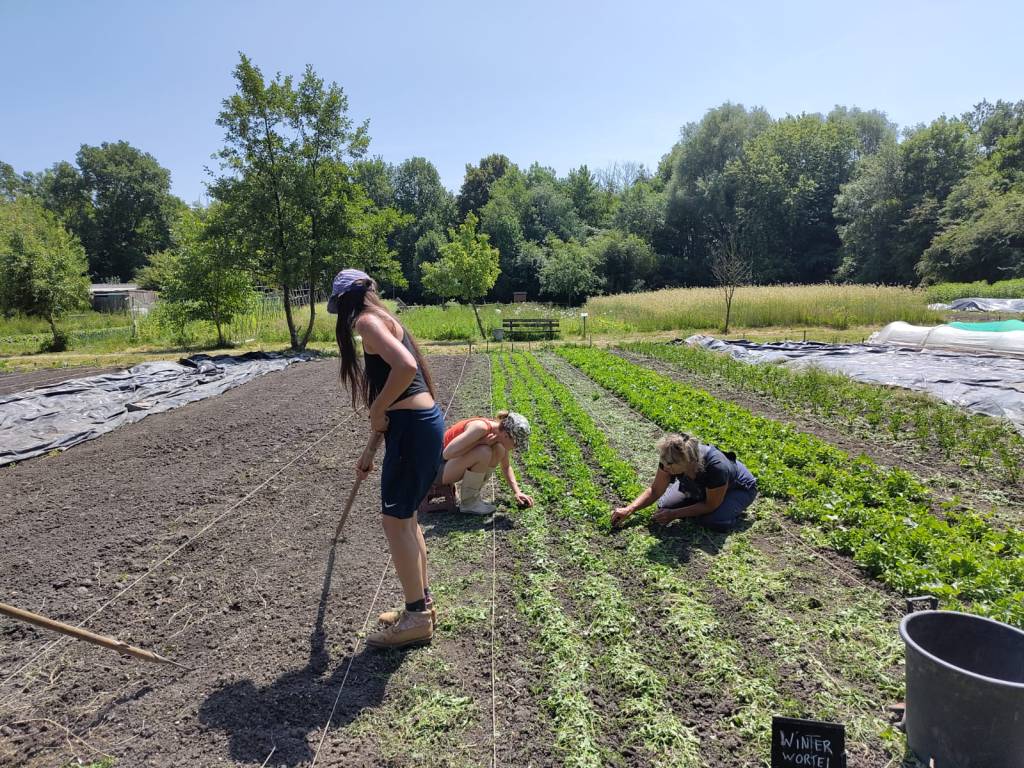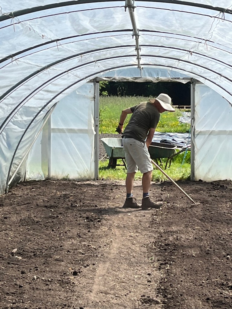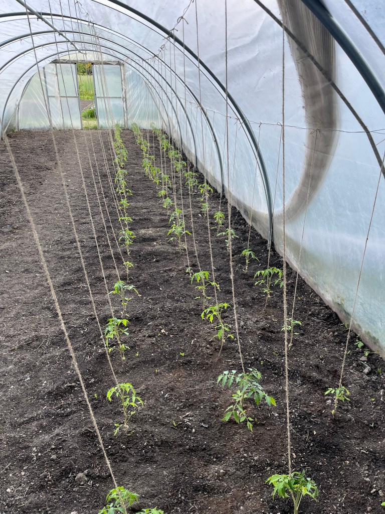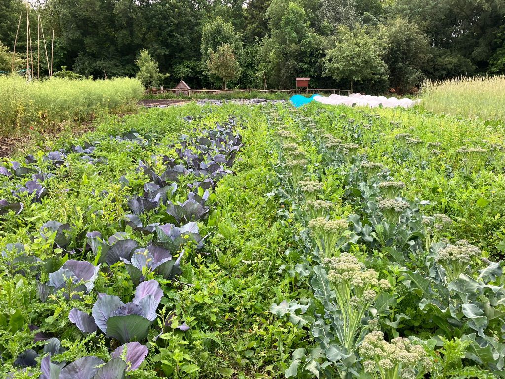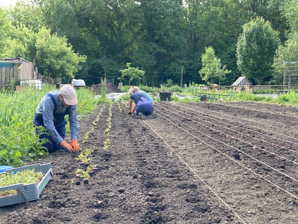 We zijn bijna weggesmolten vorige week, zo heet was het. Gelukkig was er in de vroege ochtend nog wat nachtkoelte zodat de tomaten gediefd en opgebonden konden worden. We hebben afgelopen week veel planten in de grond gezet (buiten-aubergines, rijtje zoete aardappelen, knolvenkel, radicchio, knolselderij, nieuwzeelandse spinazie) maar er ook veel uit getrokken (bijkruiden/ onkruiden/ ongewilde kruiden, zoals knopkruid bij de winterwortelen en andere gewassen). Langzaam aan met de aanhoudende wind en de hoge temperaturen wordt de bodem droger en zijn we begonnen met het nu en dan beregenen. Helaas werkt de pomp nog suboptimaal maar er wordt aan gewerkt. Voor de tussentijd duim ik voor een paar dagen regen.