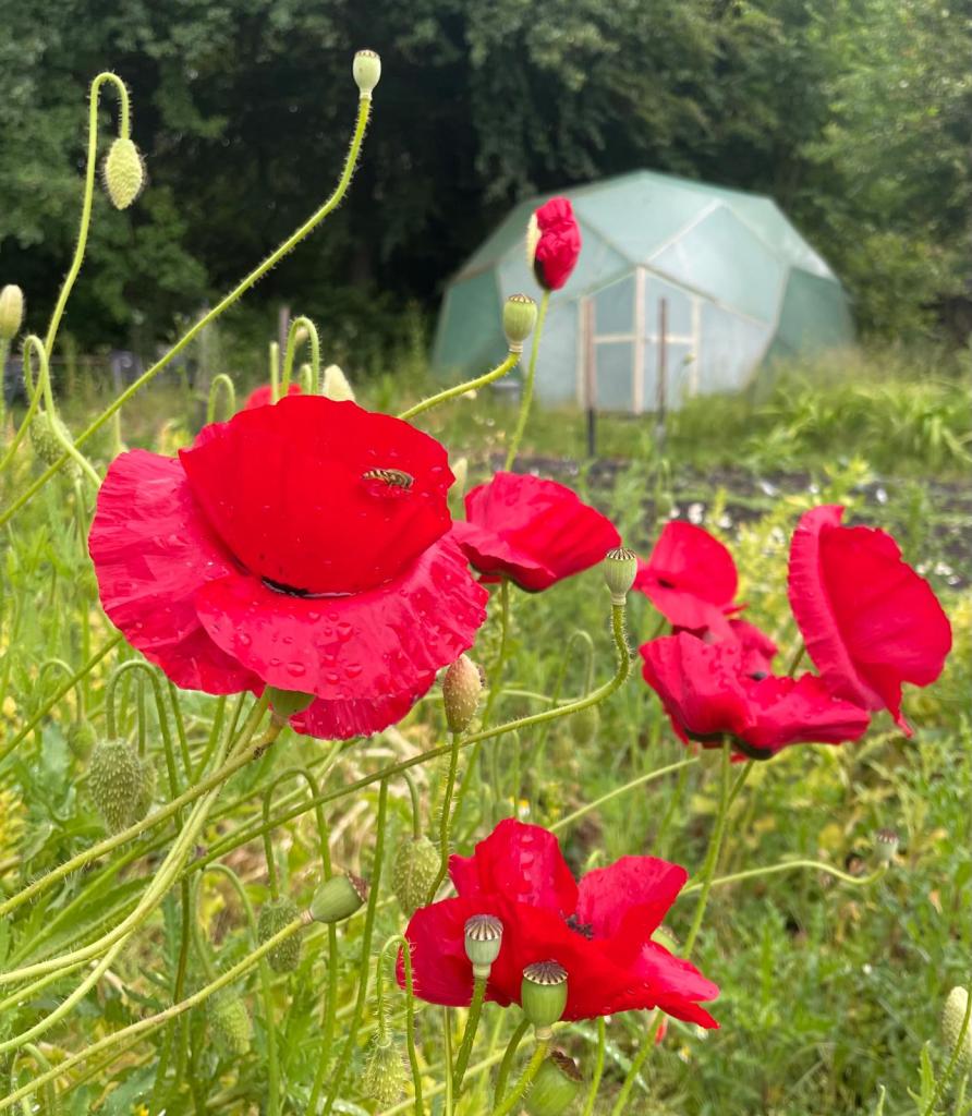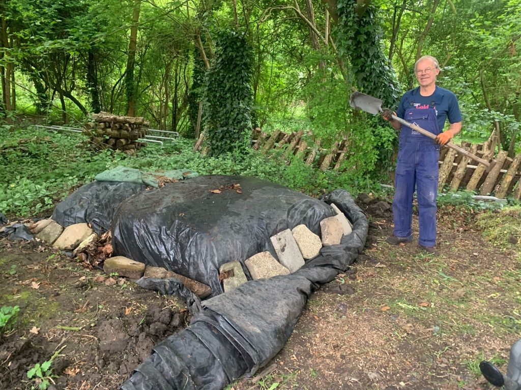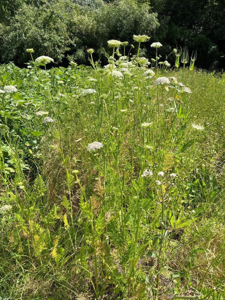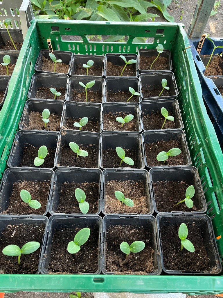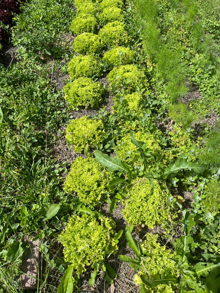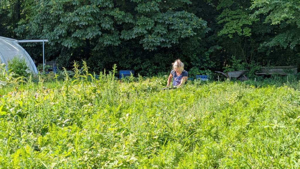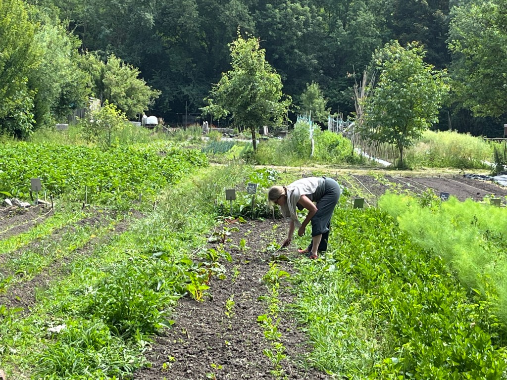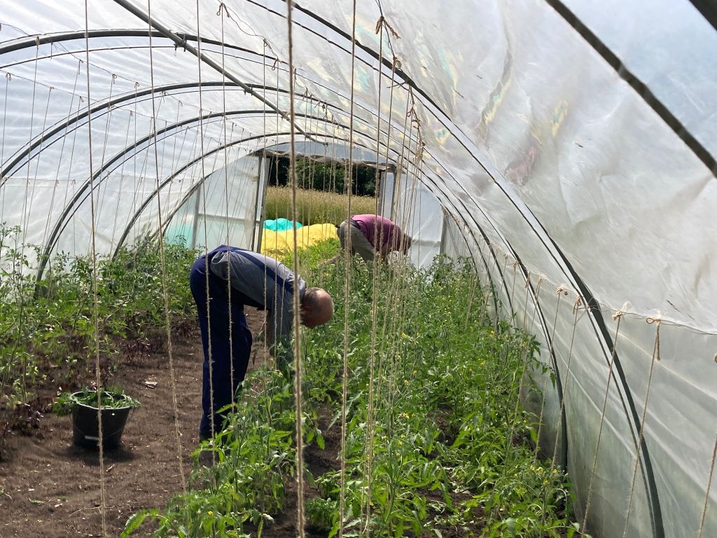 We zijn bijna weggesmolten vorige week, zo heet was het. Gelukkig was er in de vroege ochtend nog wat nachtkoelte zodat de tomaten gediefd en opgebonden konden worden. We hebben afgelopen week veel planten in de grond gezet (buiten-aubergines, rijtje zoete aardappelen, knolvenkel, radicchio, knolselderij, nieuwzeelandse spinazie) maar er ook veel uit getrokken (bijkruiden/ onkruiden/ ongewilde kruiden, zoals knopkruid bij de winterwortelen en andere gewassen). Langzaam aan met de aanhoudende wind en de hoge temperaturen wordt de bodem droger en zijn we begonnen met het nu en dan beregenen. Helaas werkt de pomp nog suboptimaal maar er wordt aan gewerkt. Voor de tussentijd duim ik voor een paar dagen regen.