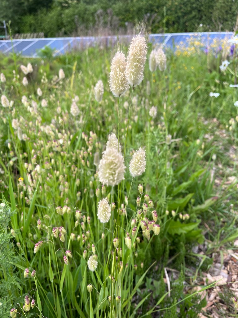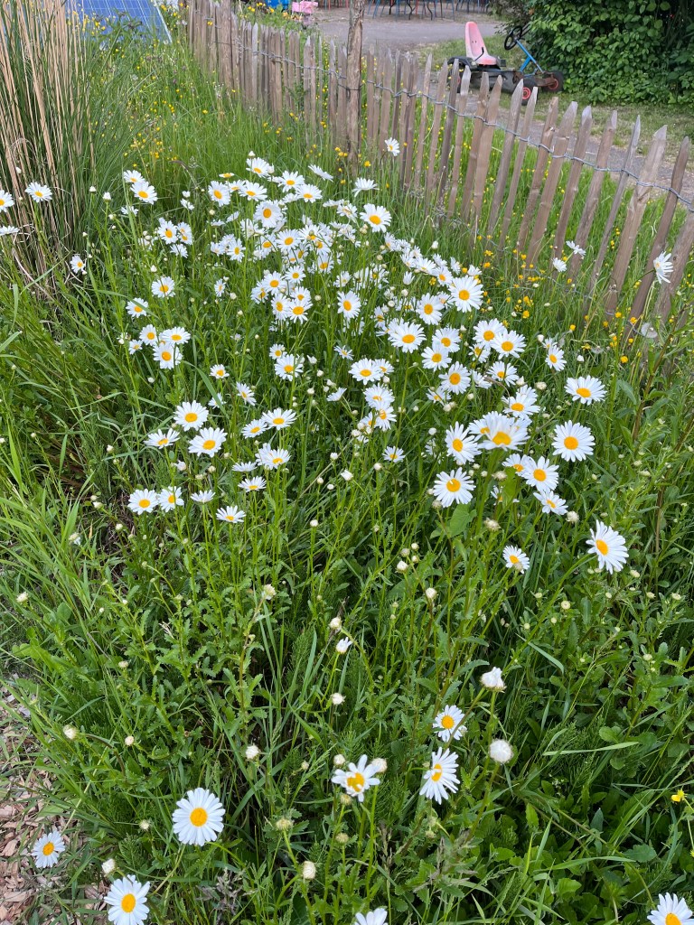 Bloementuin Margrieten, gele kamillie, groot trilgras, leeuwenbekjes, goudsbloemen, verbena, riddersporen en steek er wat winterrogge halmen bij en je hebt een prachtig boeketje (van max 10 stelen). Let op de groene vlaggetjes. Op bed 2 naast de zonnebloemen staan wortelschermen en die mag je ook plukken. Staan prachtig in een boeket.
