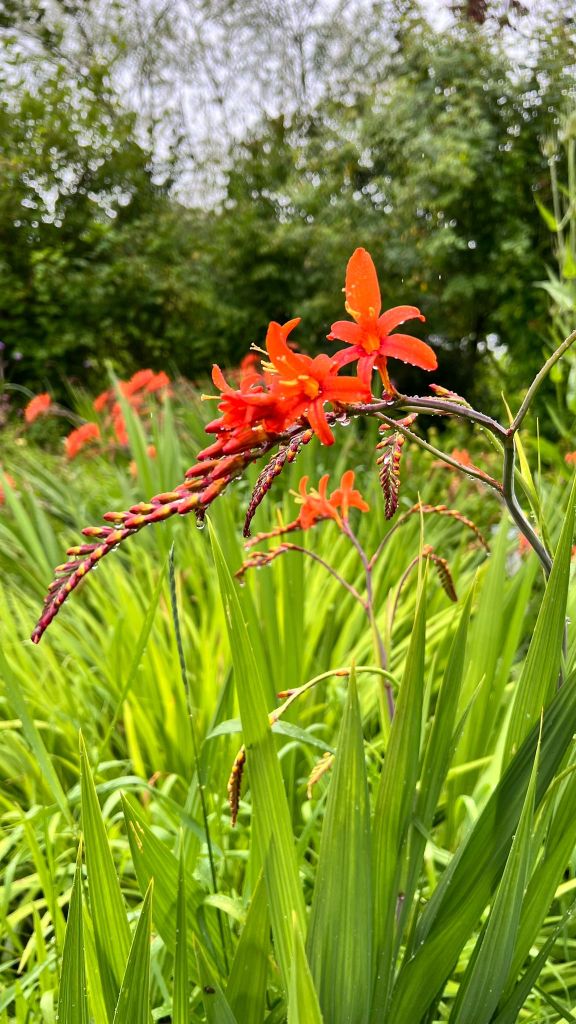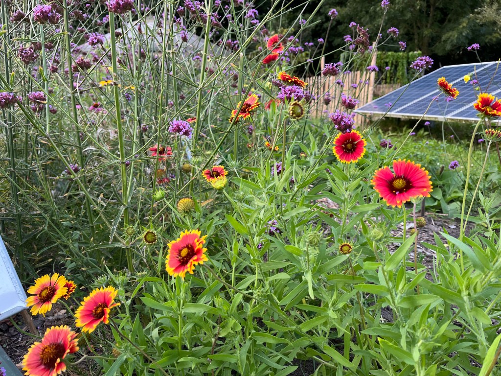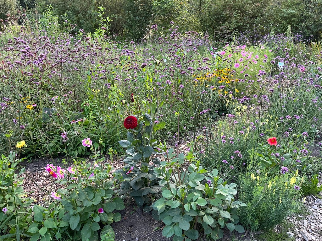 Bloemen Groot trilgras/Hazenstaartjes Kanariegras/Rode gele naald aar/Leeuwenbekjes/ goudsbloemen/ Ijzerhard/Crocosmeas/Adderwortel/ Cosmeas/ Goudsbloemen/Verbena hastata/ Kaardenbol/ Eerste dahlias, zonnehoedjes, zinnias/ akkerschermen/ kokarde/ Hoog Siergas/ Abbessijnse gladiolen.