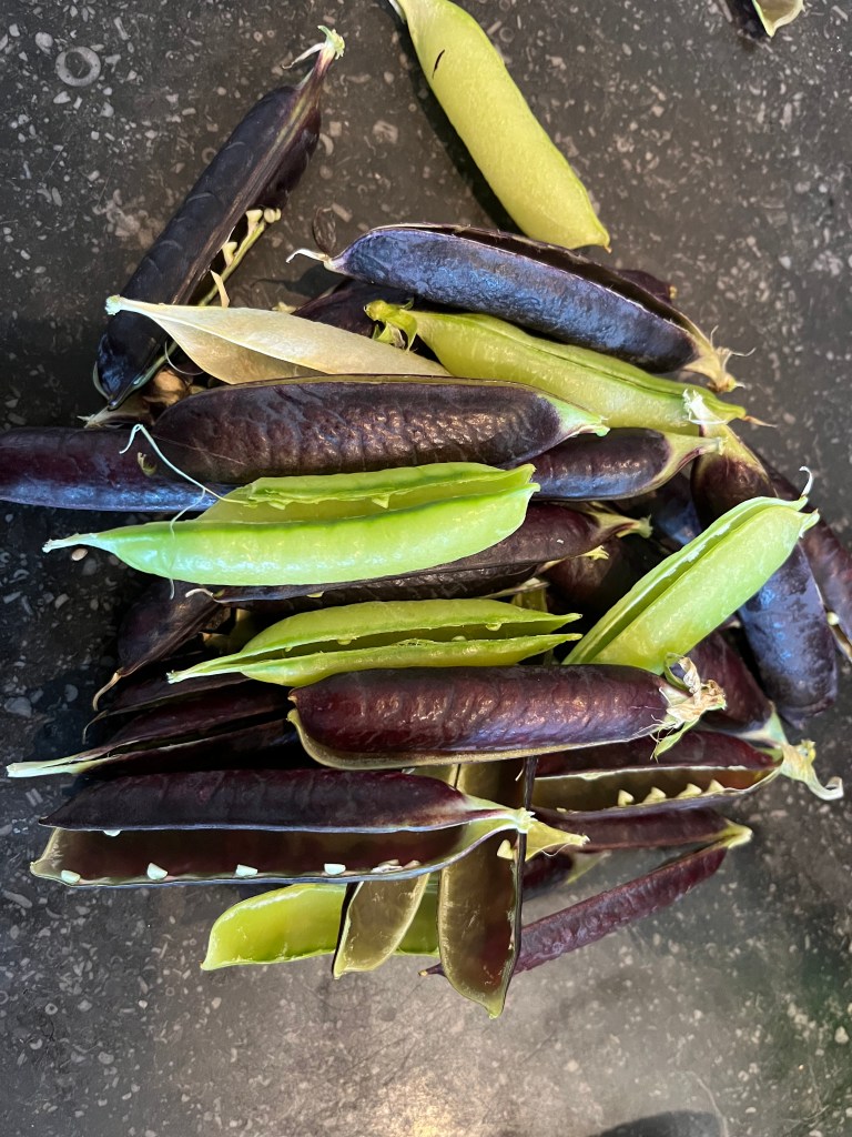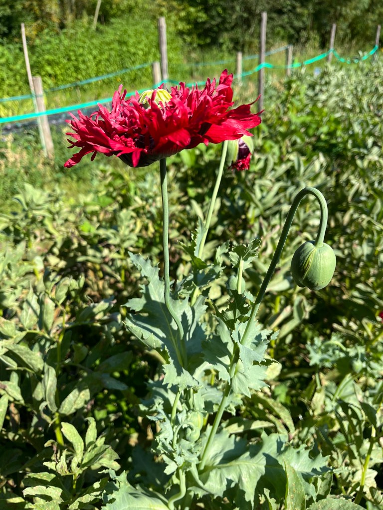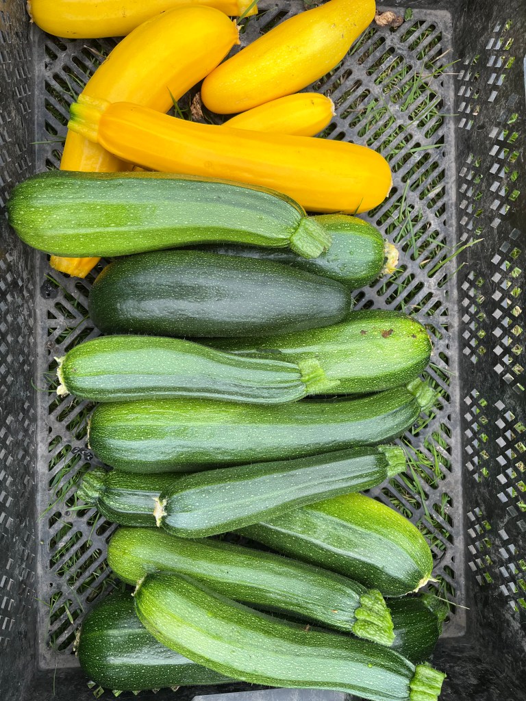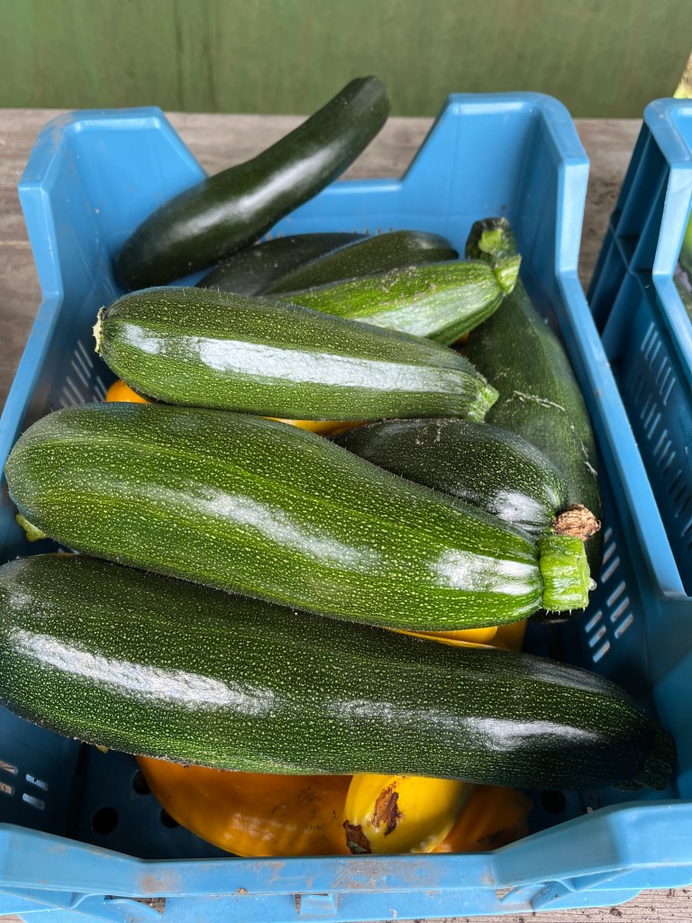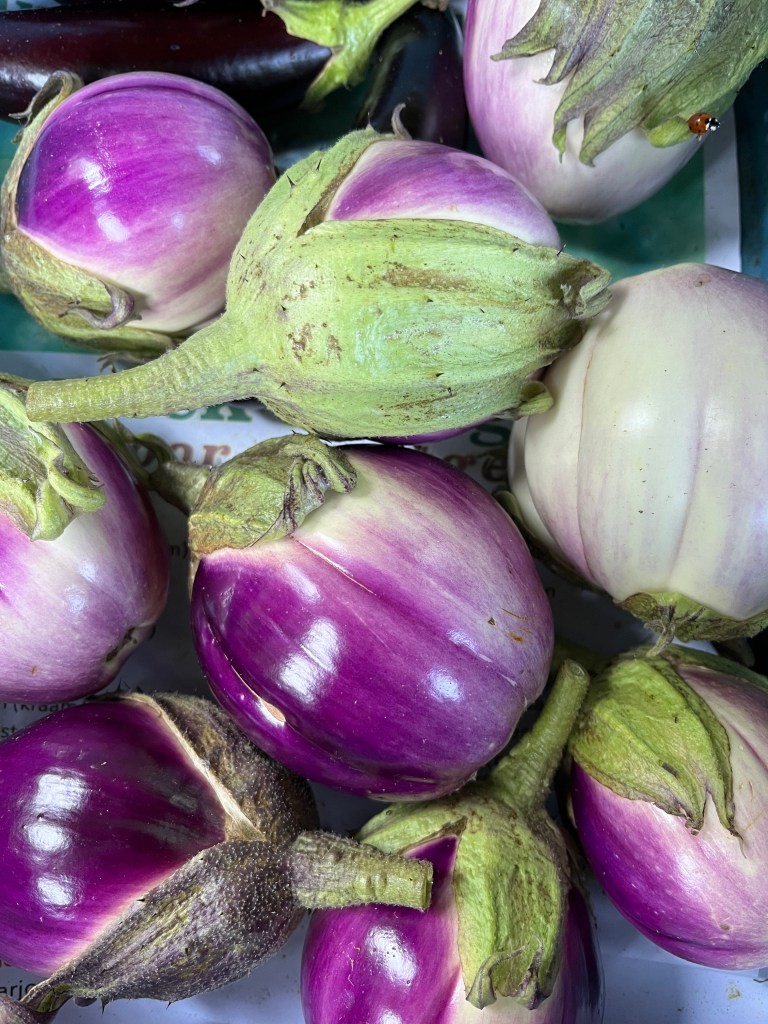 De aubergines beginnen het lichtjes te doen, en zodra er rijpe exemplaren zijn leggen we die op de kraam. Nog niet genoeg voor iedereen maar het begin is er. Ze zijn prachtig: we hebben dunne lange paarse, kleine ronde rode, grote beursvormige paarse. En ze hebben allemaal een naam maar die moet ik nog even nazoeken. Dat houden jullie nog van me tegoed. En soms liggen er ook pattisons op de kraam. Die verbouw ik voor restaurant Renilde maar zij willen vooral de hele kleine. Dus oogsten wij voor jullie de grote exemplaren zodat de planten blijven geven.