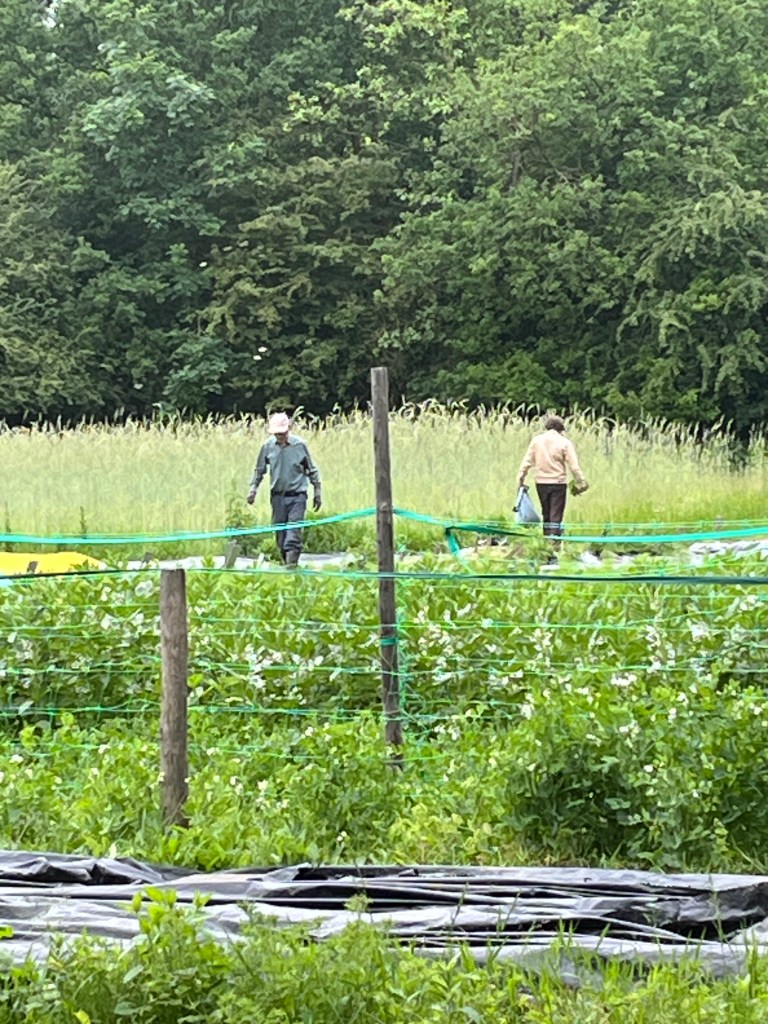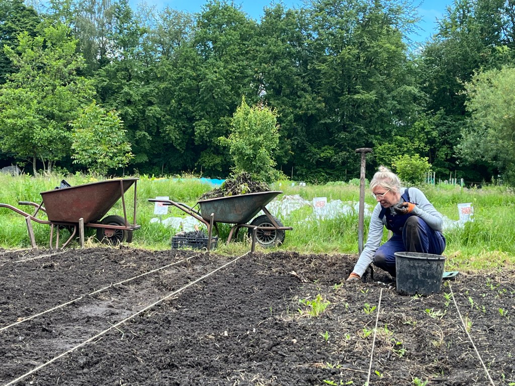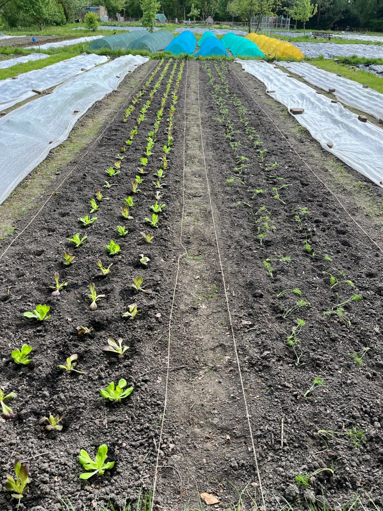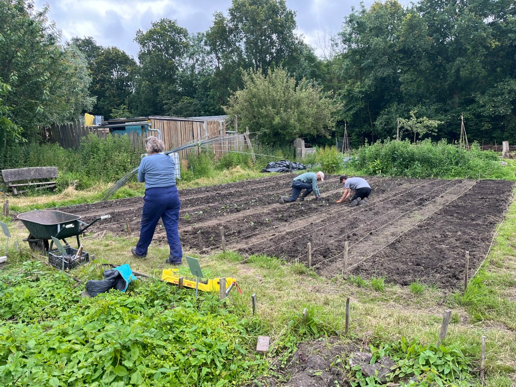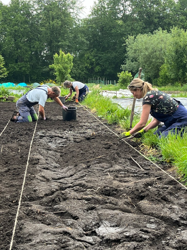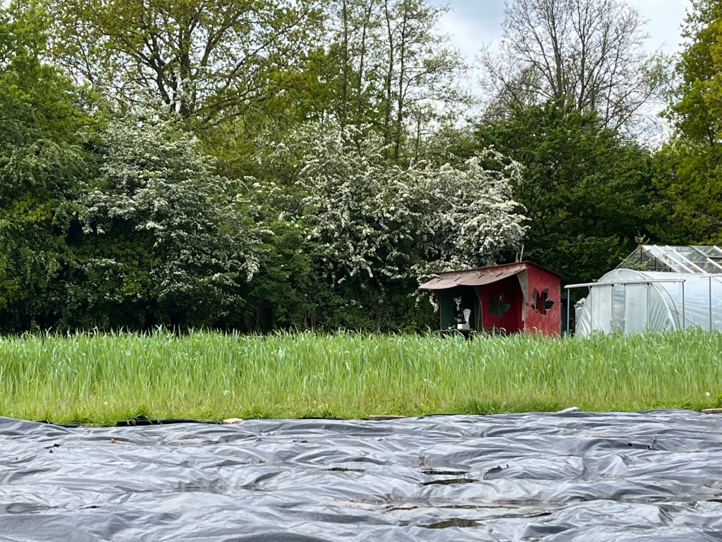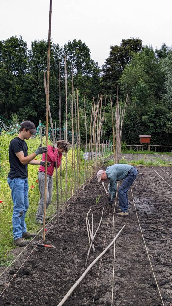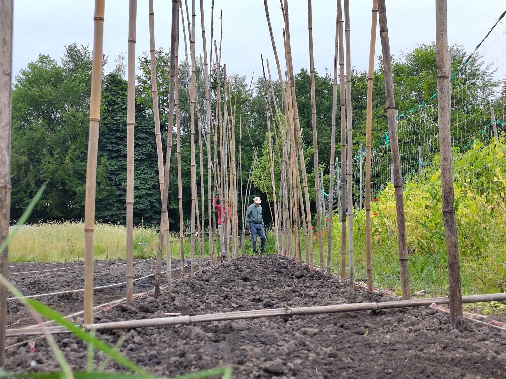 Langzaam halen we onze achterstand in: de eerste twee rijen stokbonen zijn gelegd, het eerste bed stamslabonen zit erin. De aubergines, de speciale courgettes, de eikenbladsla, bindsla en roodlof zijn geplant, en in bloementuin de zinnias, cosmeas, extra juffertjes. De franse zuring is geplant. En we hebben veel gras gemaaid, zwart plastiek opgeruimd.