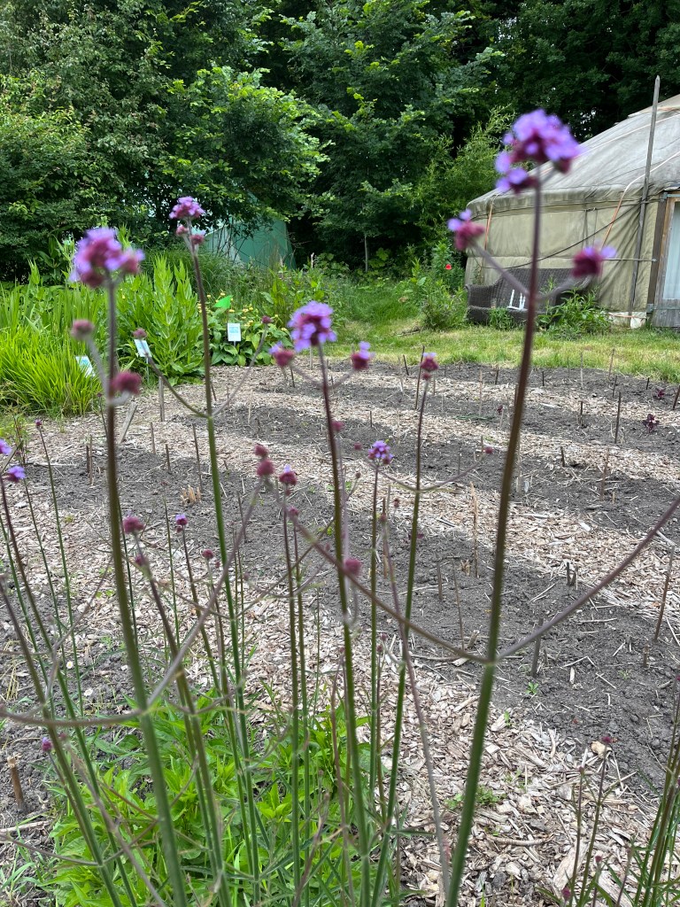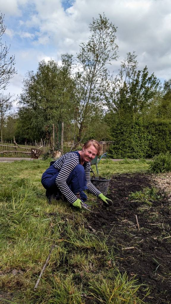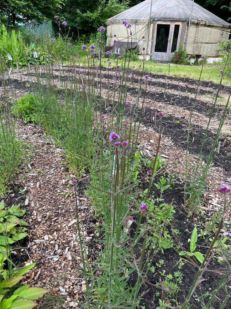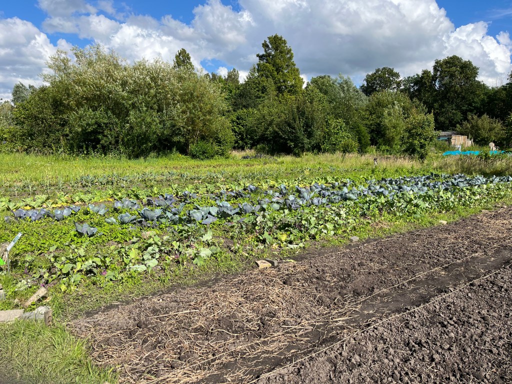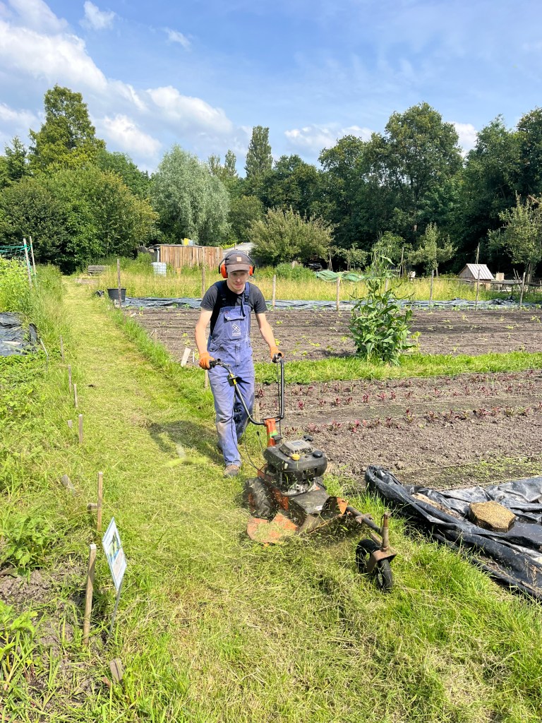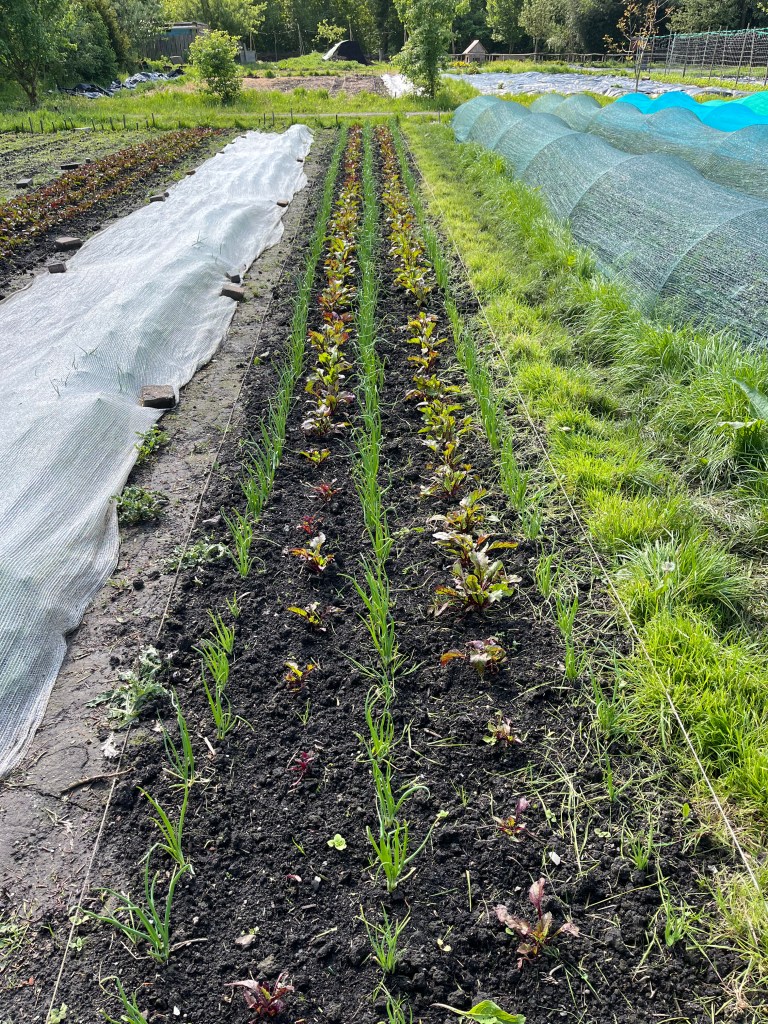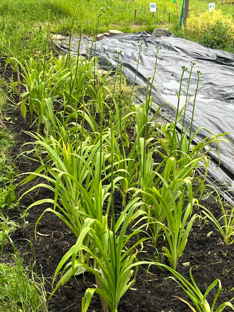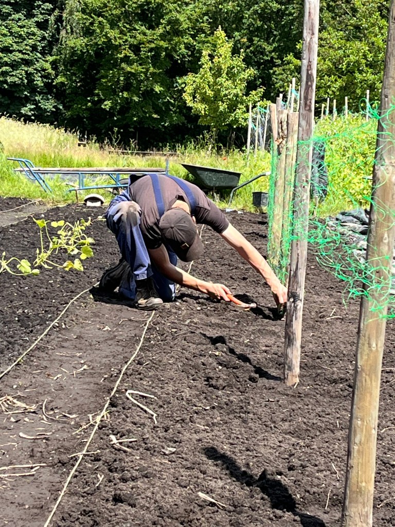 Langzaam halen we onze achterstand in: de eerste twee rijen stokbonen zijn gelegd, het eerste bed stamslabonen zit erin. De aubergines, de speciale courgettes, de eikenbladsla, bindsla en roodlof zijn geplant, en in bloementuin de zinnias, cosmeas, extra juffertjes. De franse zuring is geplant. En we hebben veel gras gemaaid, zwart plastiek opgeruimd.