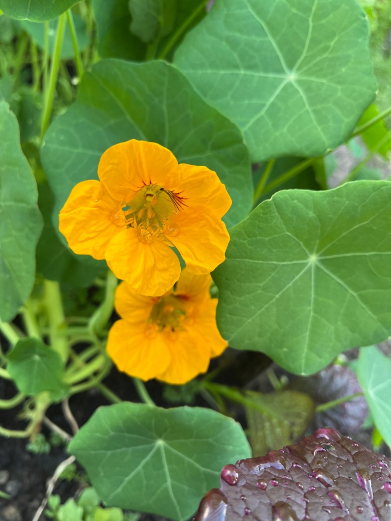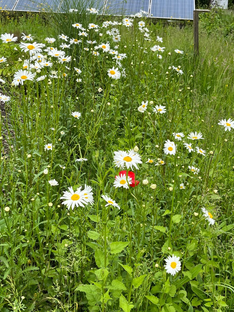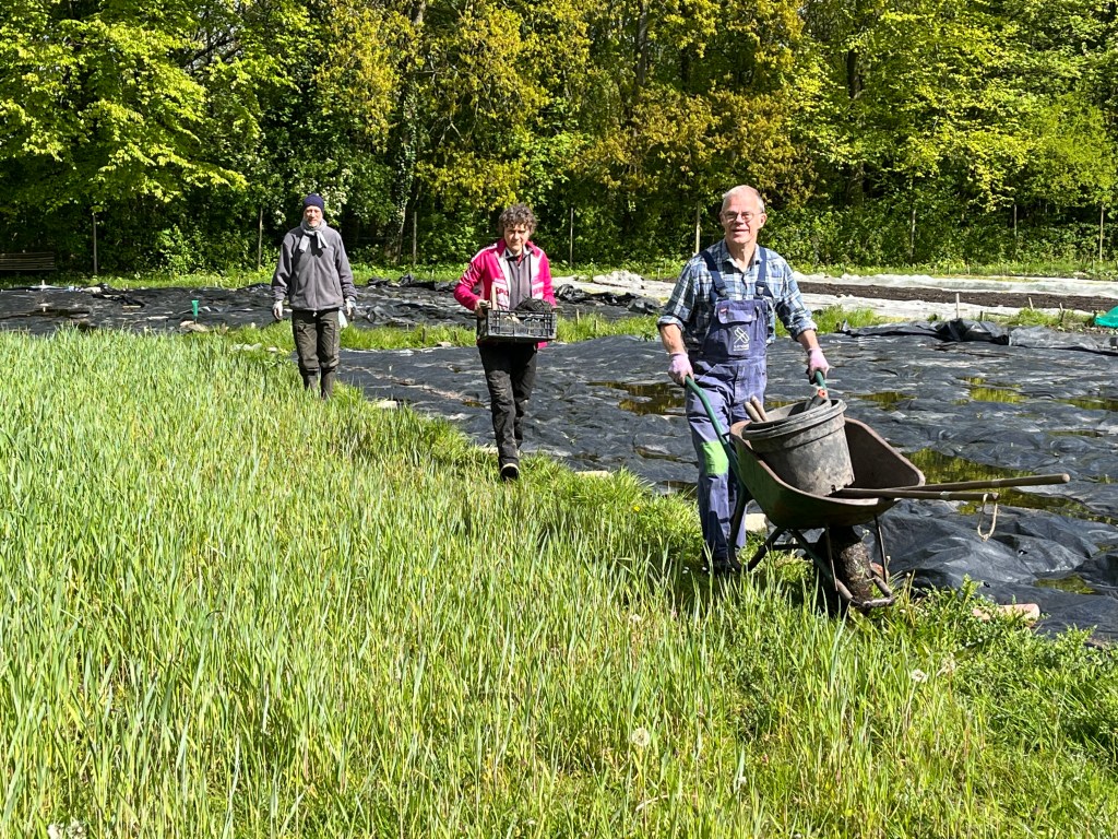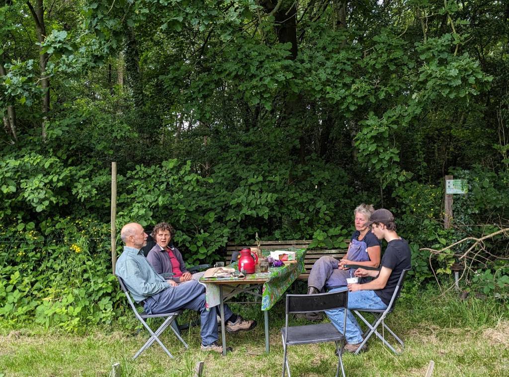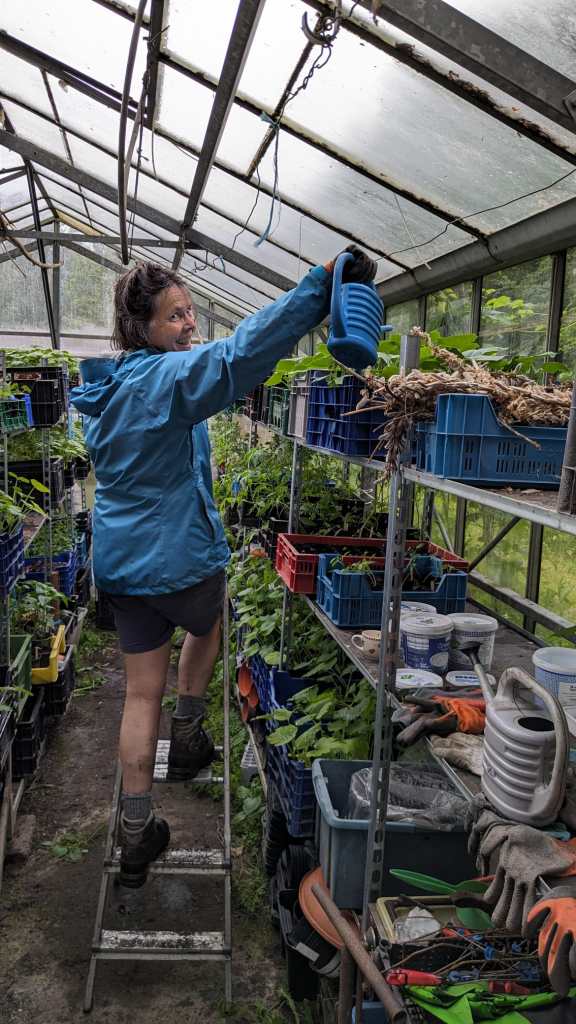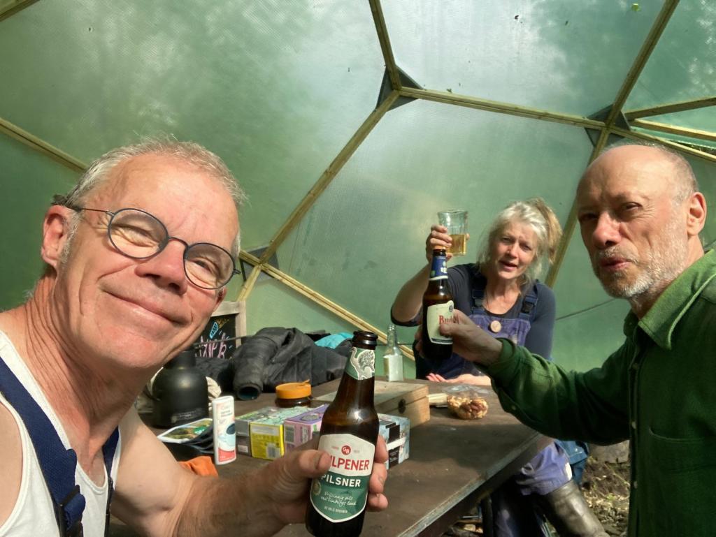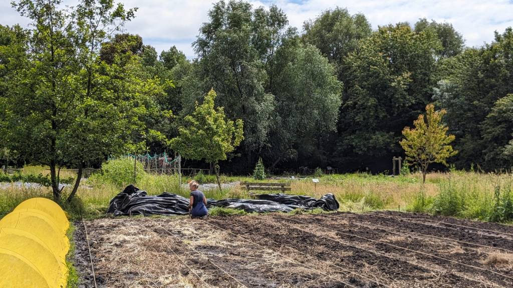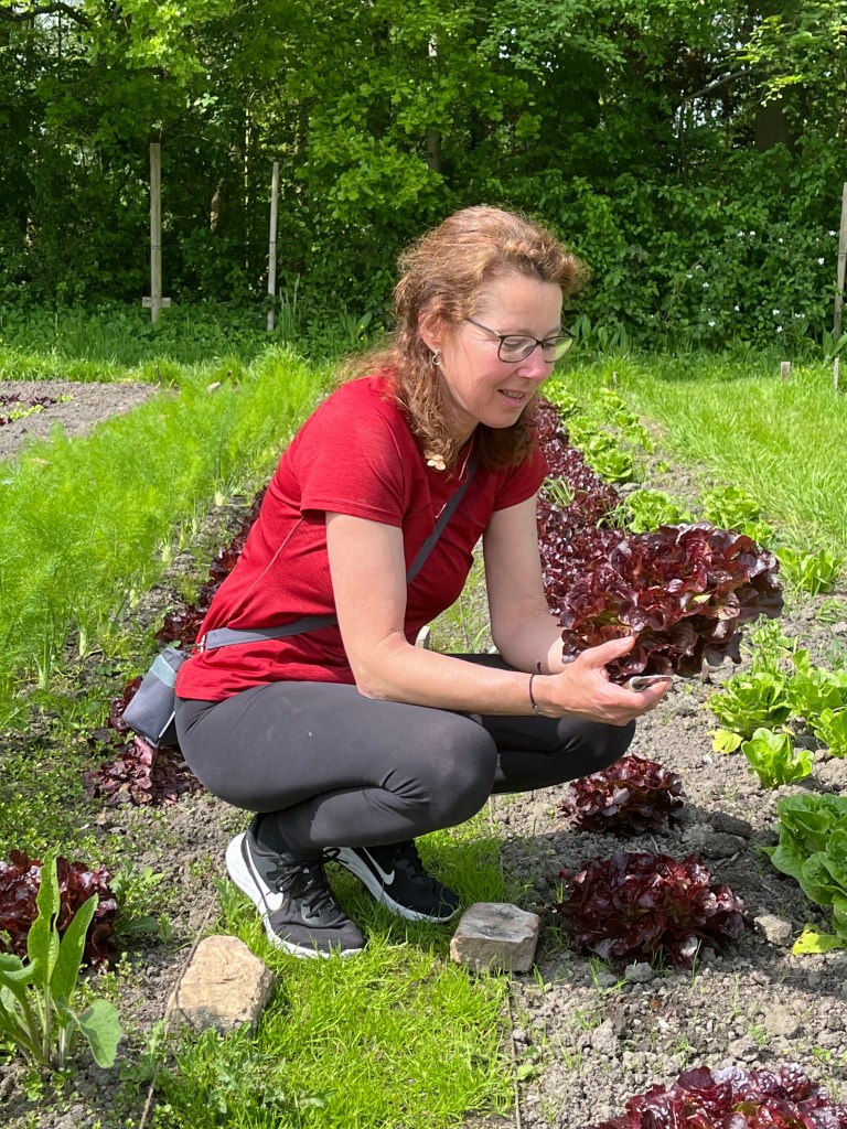 Langzaam halen we onze achterstand in: de eerste twee rijen stokbonen zijn gelegd, het eerste bed stamslabonen zit erin. De aubergines, de speciale courgettes, de eikenbladsla, bindsla en roodlof zijn geplant, en in bloementuin de zinnias, cosmeas, extra juffertjes. De franse zuring is geplant. En we hebben veel gras gemaaid, zwart plastiek opgeruimd.