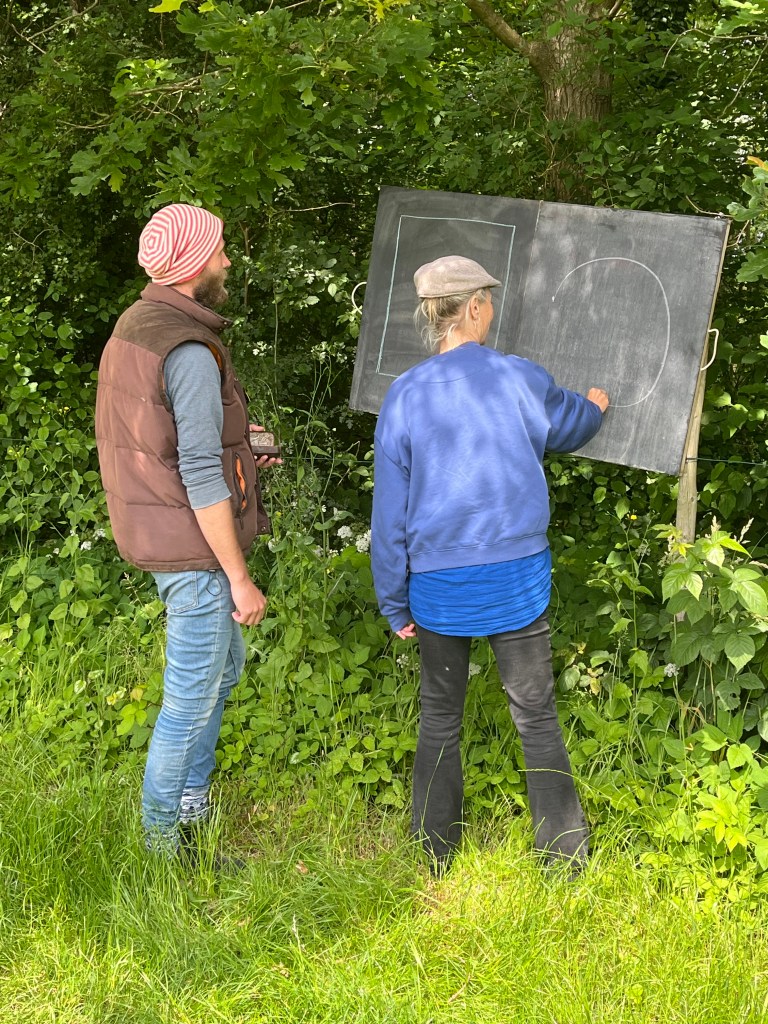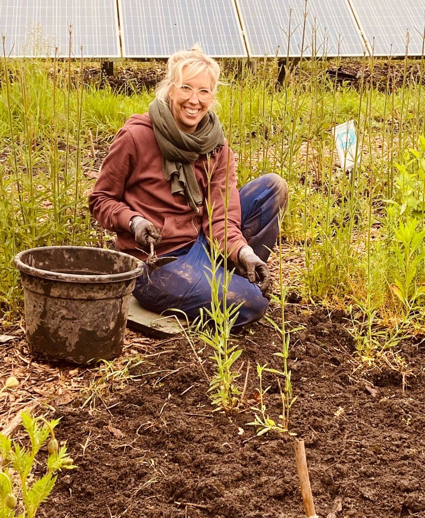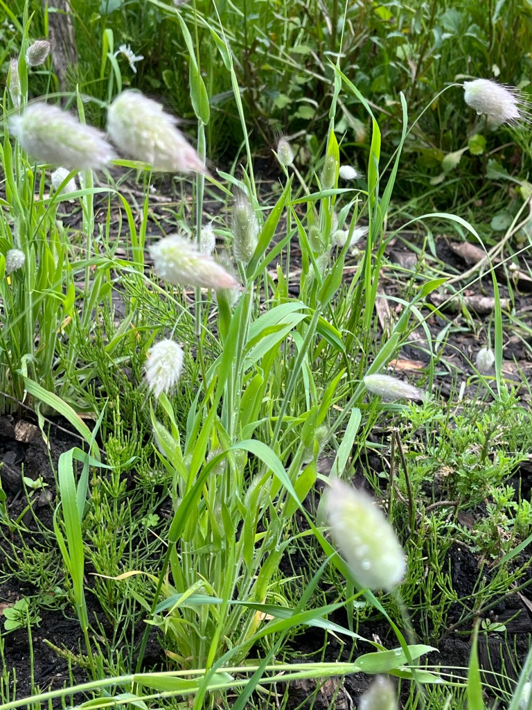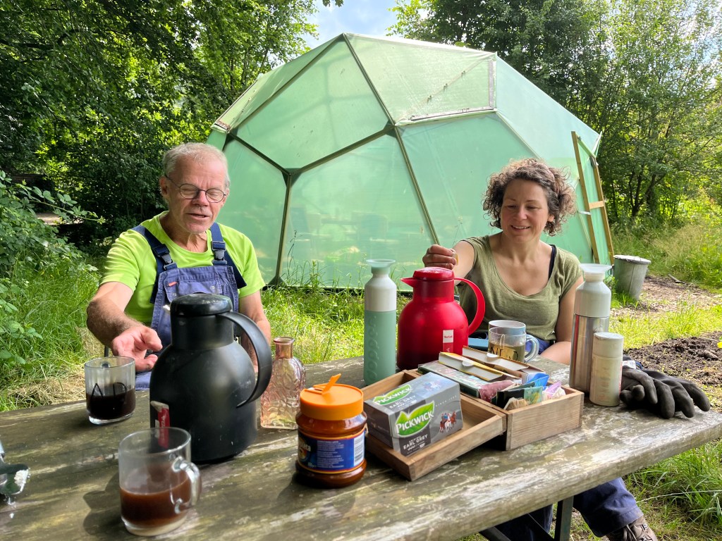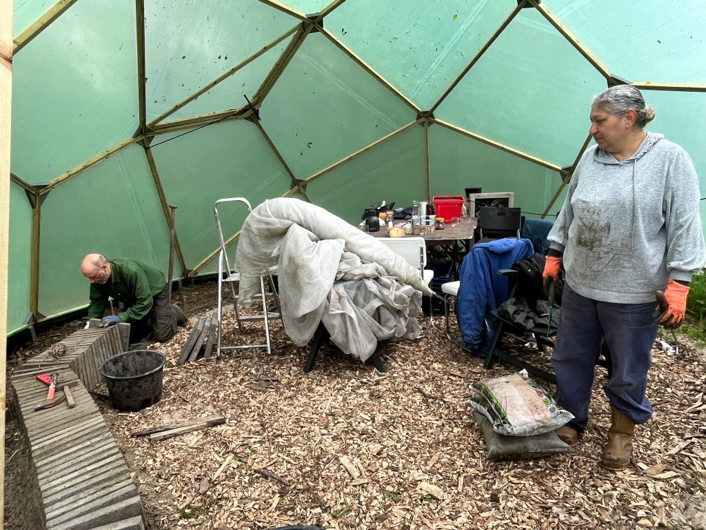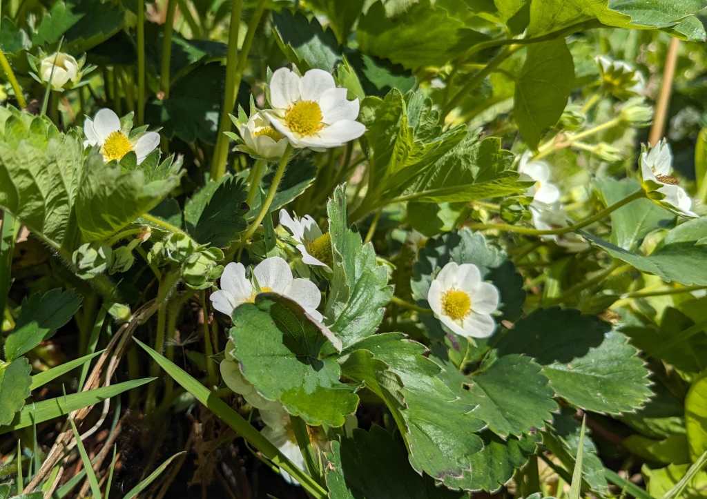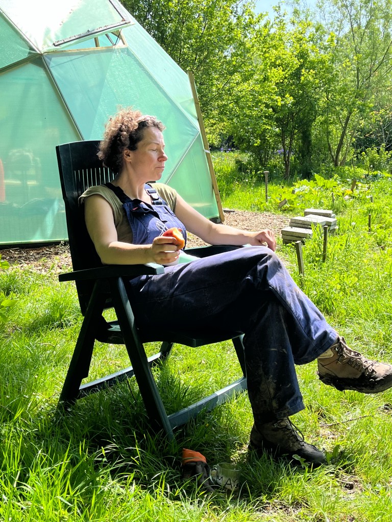 Langzaam halen we onze achterstand in: de eerste twee rijen stokbonen zijn gelegd, het eerste bed stamslabonen zit erin. De aubergines, de speciale courgettes, de eikenbladsla, bindsla en roodlof zijn geplant, en in bloementuin de zinnias, cosmeas, extra juffertjes. De franse zuring is geplant. En we hebben veel gras gemaaid, zwart plastiek opgeruimd.