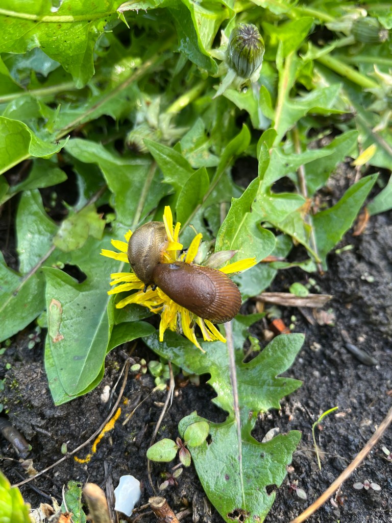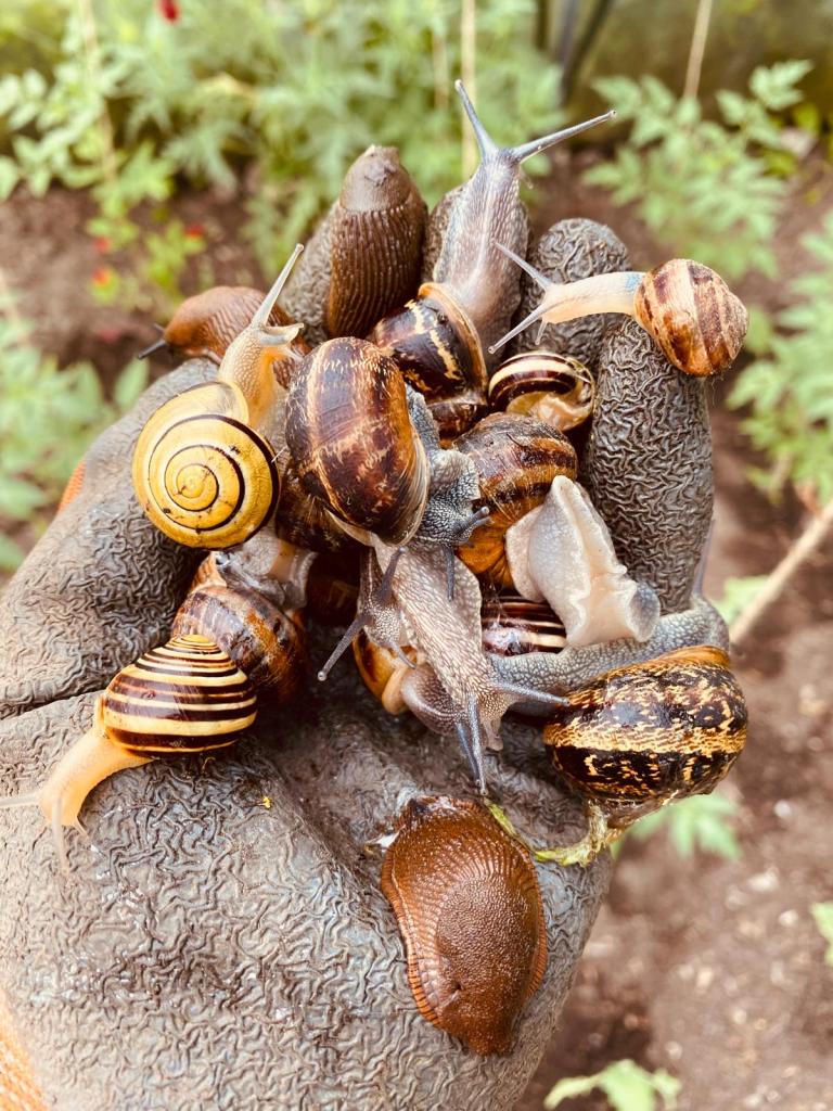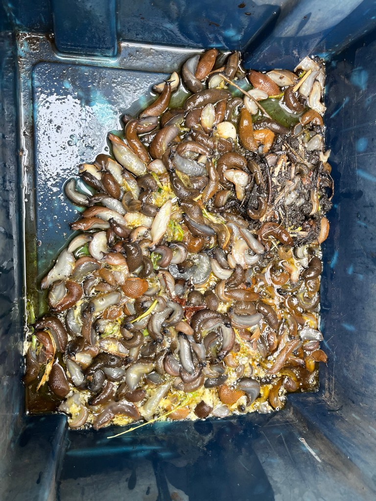 De slakken lieten zich vorige week nog eenmaal goed zien en sommige dahlias zijn alweer aangegeten maar het goede nieuws is dat de slakkenvraat steeds minder wordt. Onze slakkengier lijkt toch echt wel te werken!